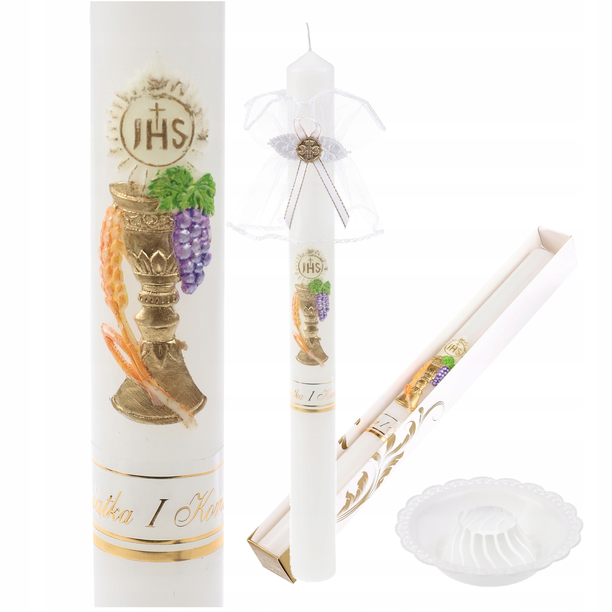 Свеча для причастия – особый элемент таинственного обряда. Эта свеча украшена мотивом чаши, символизирующей Евхаристию, и буквами «IHS», латинским сокращением имени Иисуса Христа. Кроме того, мотив винограда символизирует кровь Христа и духовную плодотворность.