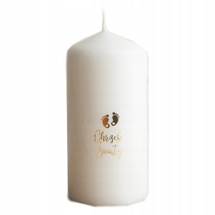 - белая свеча-столб, украшенная блестящей наклейкой с надписью «Святое Крещение» и мотивом золотых стоп