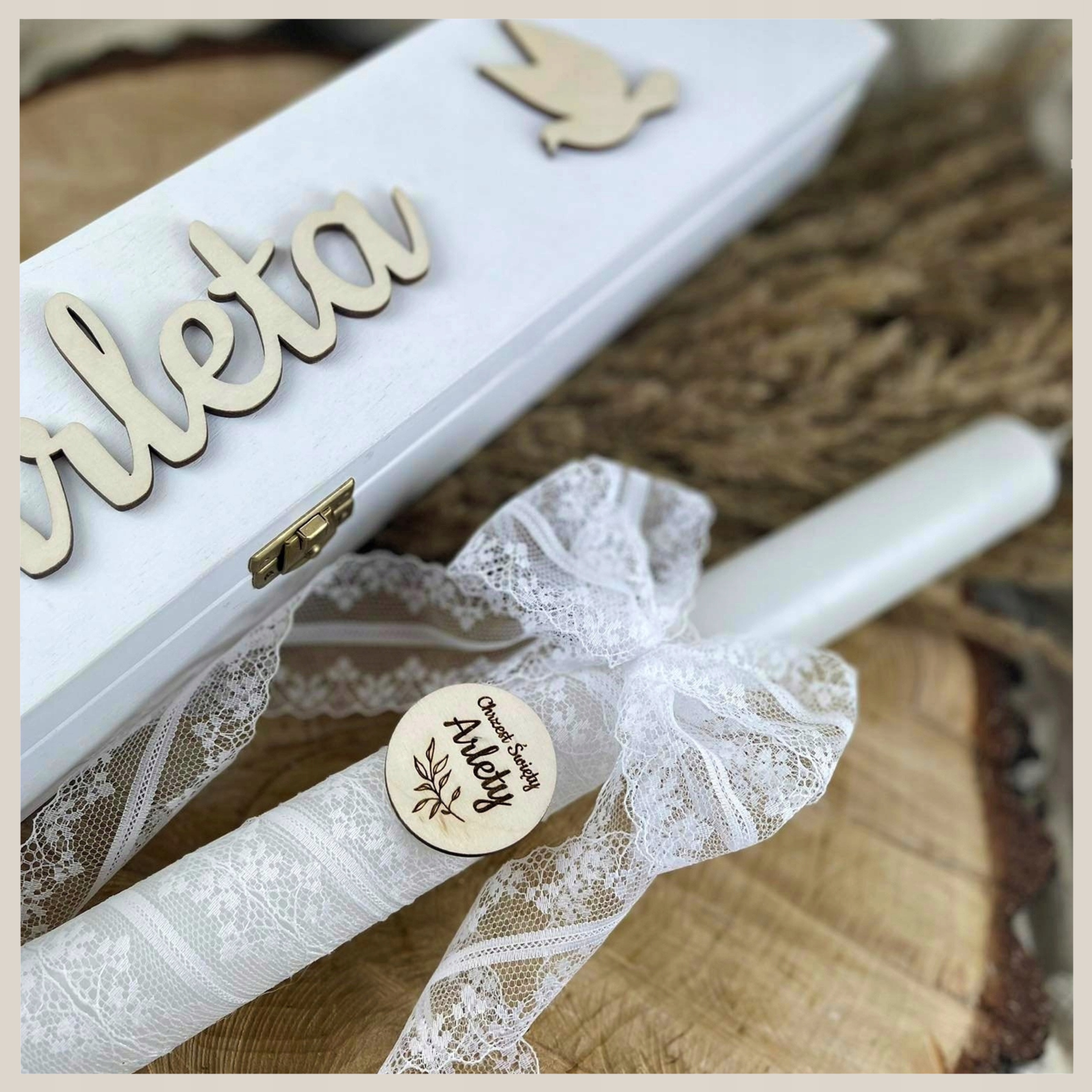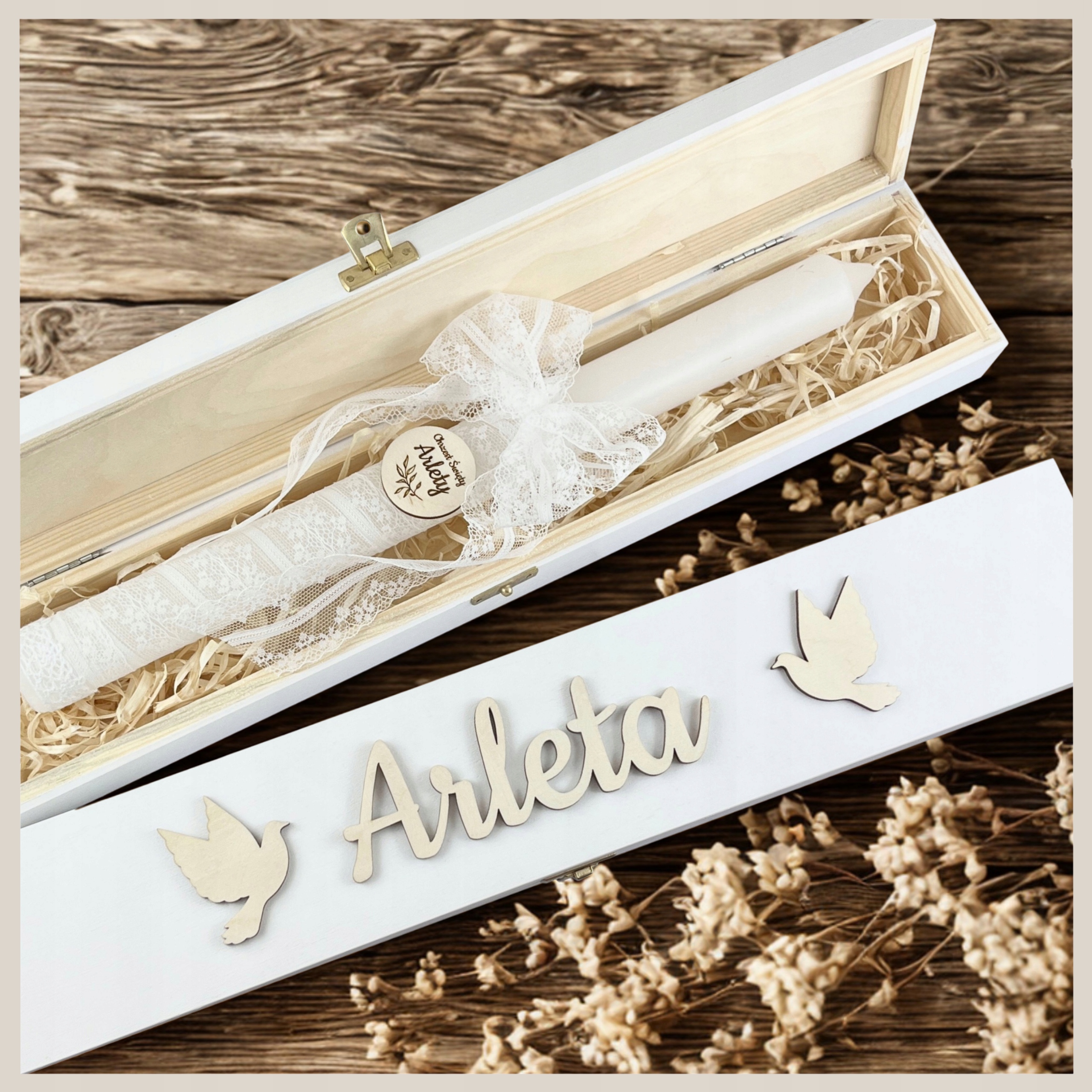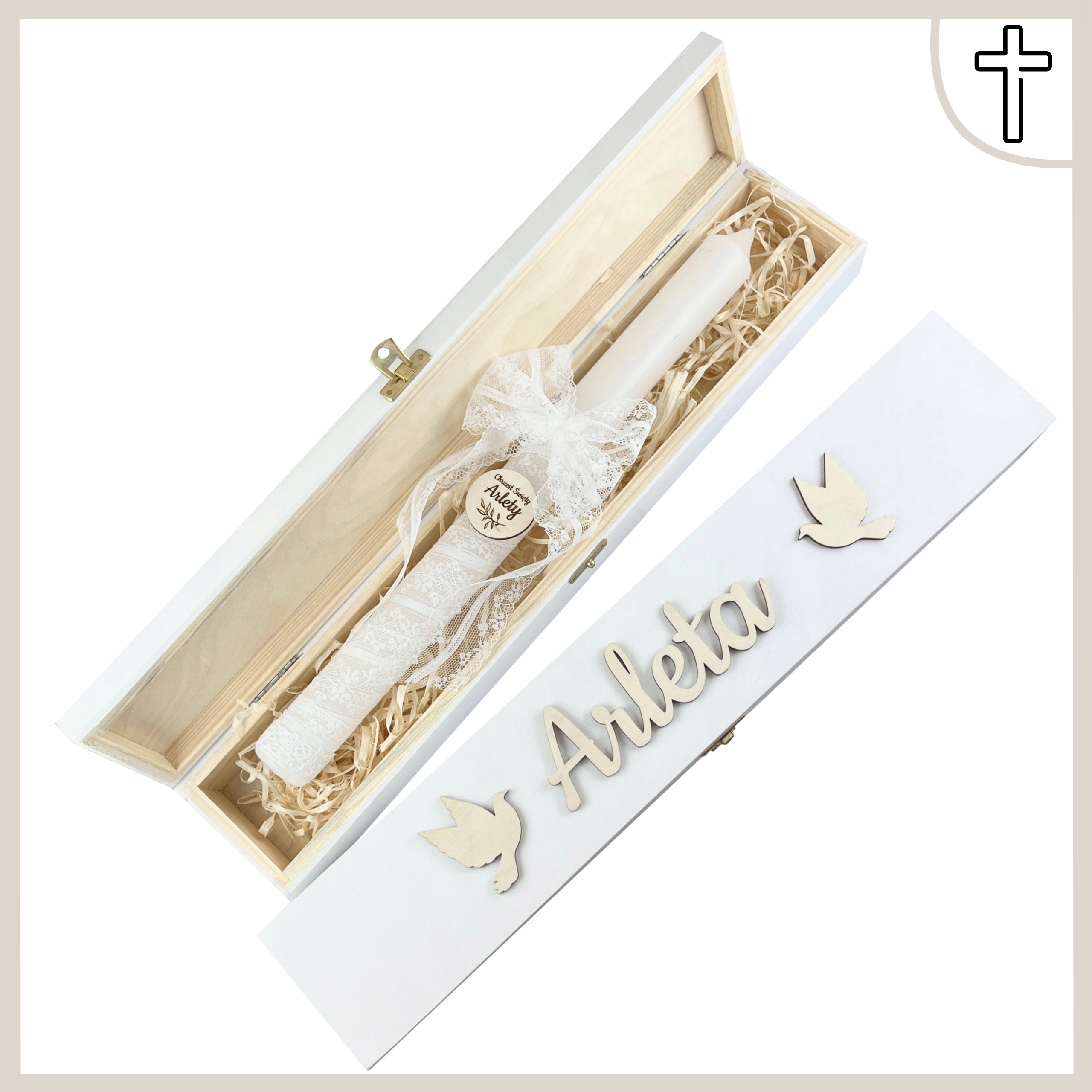 КРЕЩЕННАЯ СВЕЧА для крещения с выгравированным собственным именем, ДЕРЕВЯННАЯ КОРОБКА