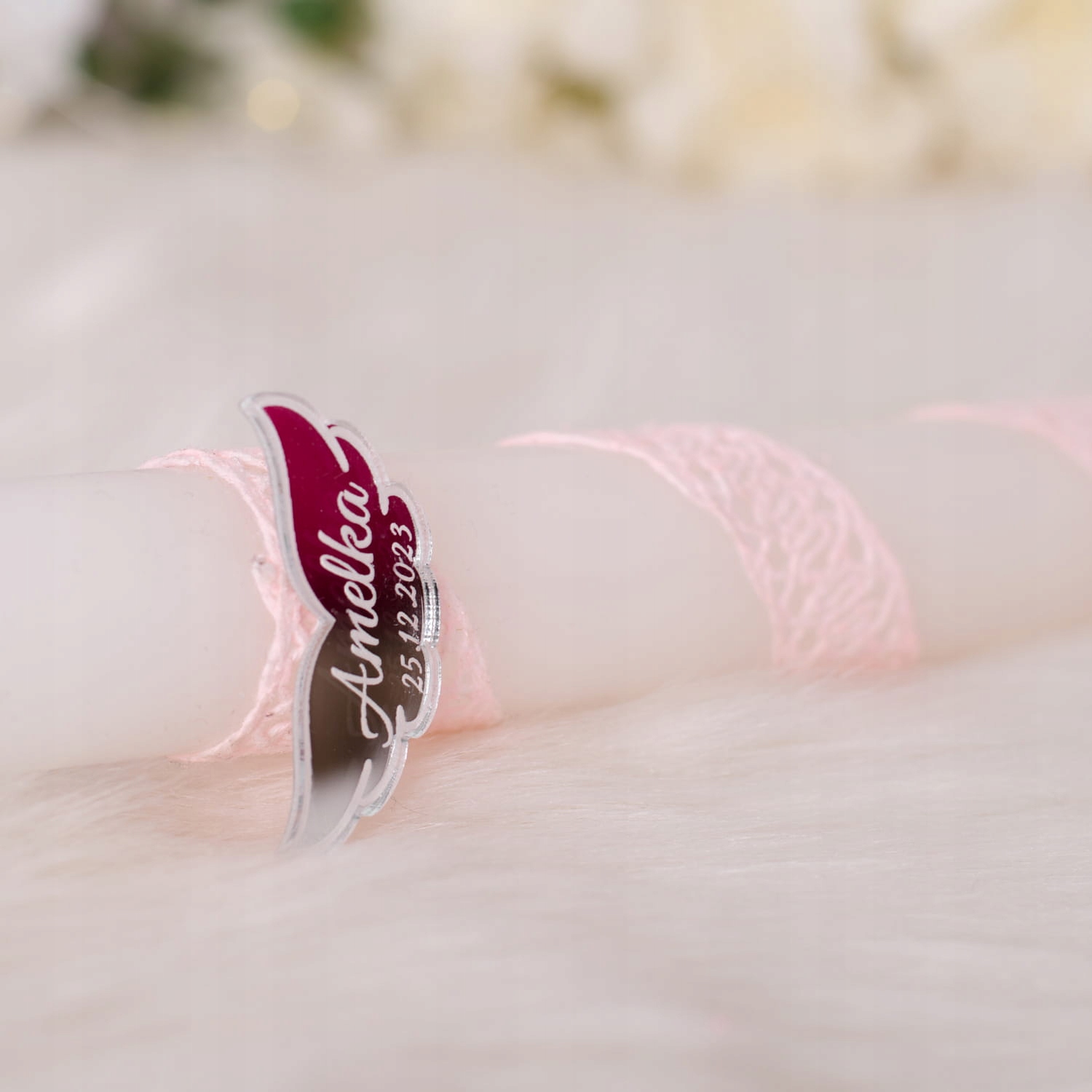 Свеча персонализирована именем ребенка и датой торжества.