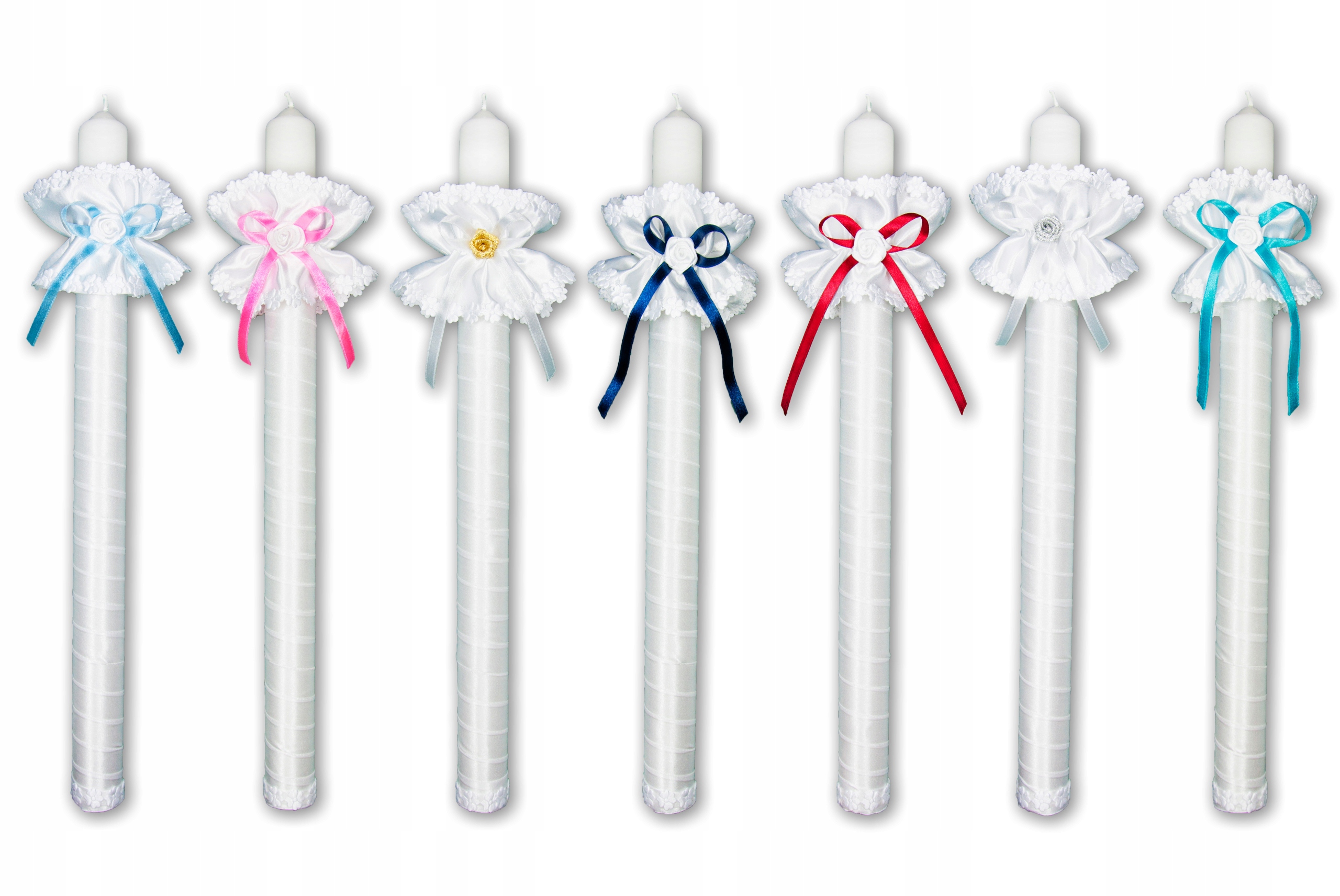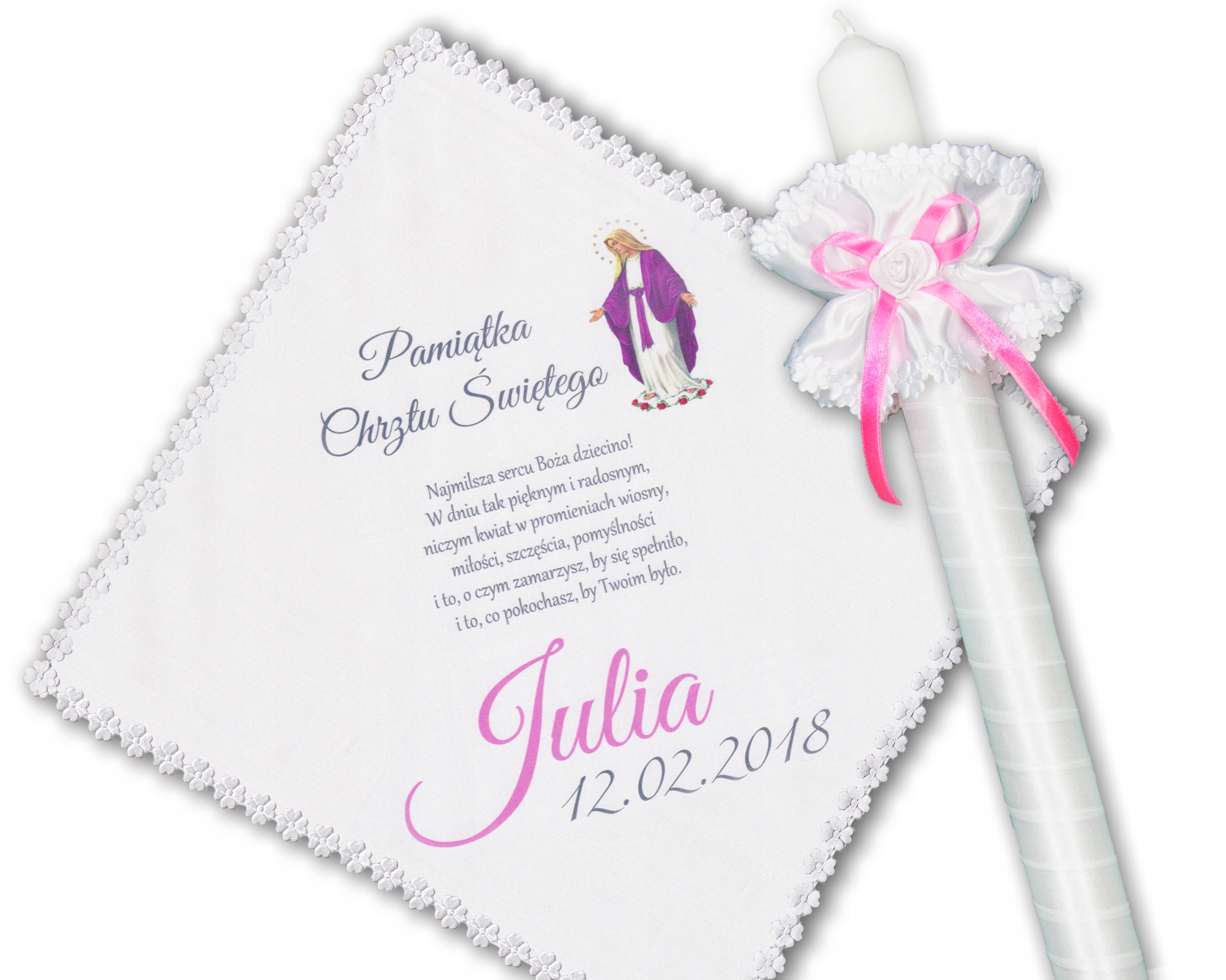 белая нарядная свеча с украшением (перком) в тон халата, розовой Богородицы и имени ребенка на футболке.