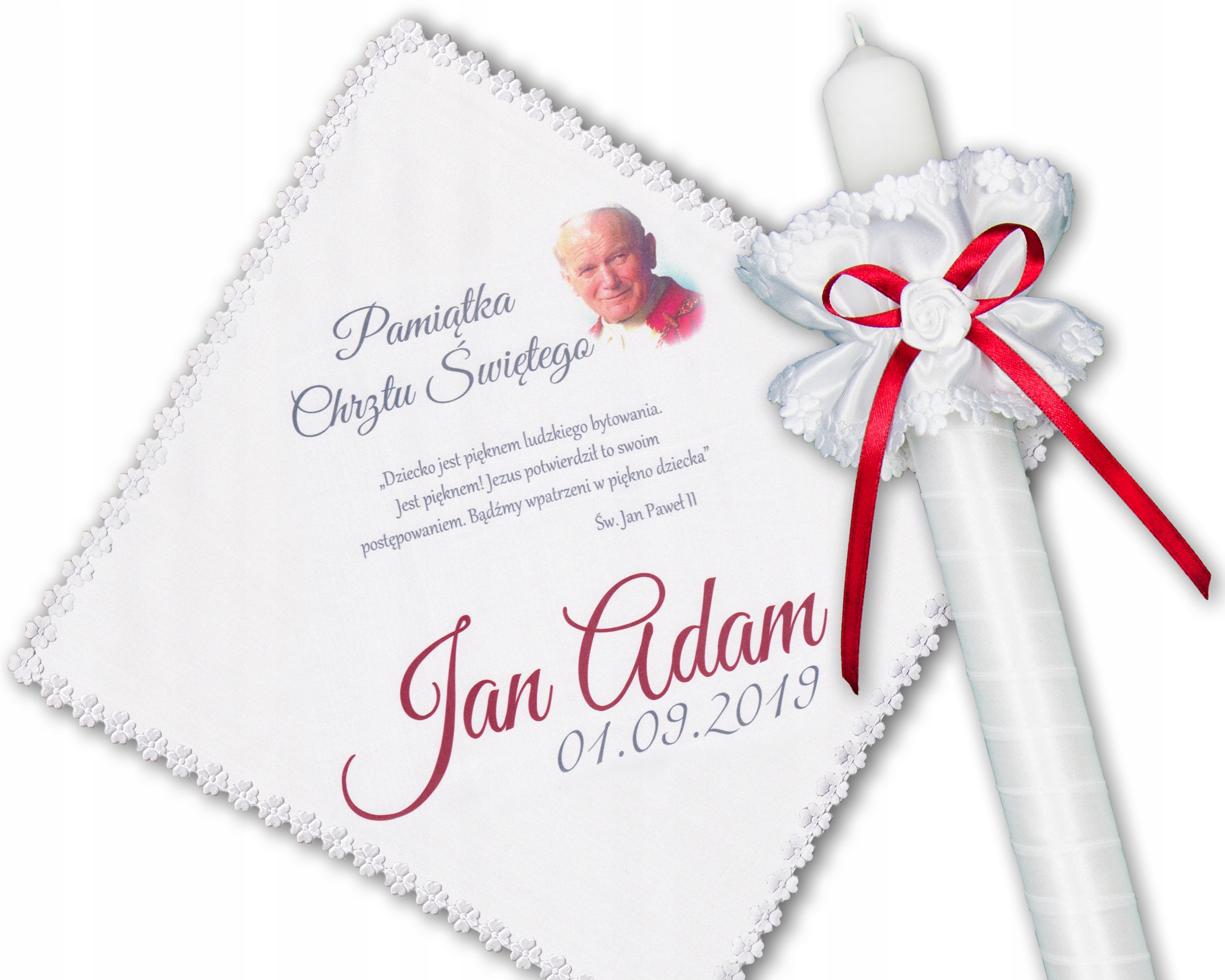 Изящная белая свеча с украшением (совершенством) под цвет мантии, на футболке - Папа Иоанн Павел II и имя ребенка бордового цвета. Идеальная модель как для девочек, так и для мальчиков.