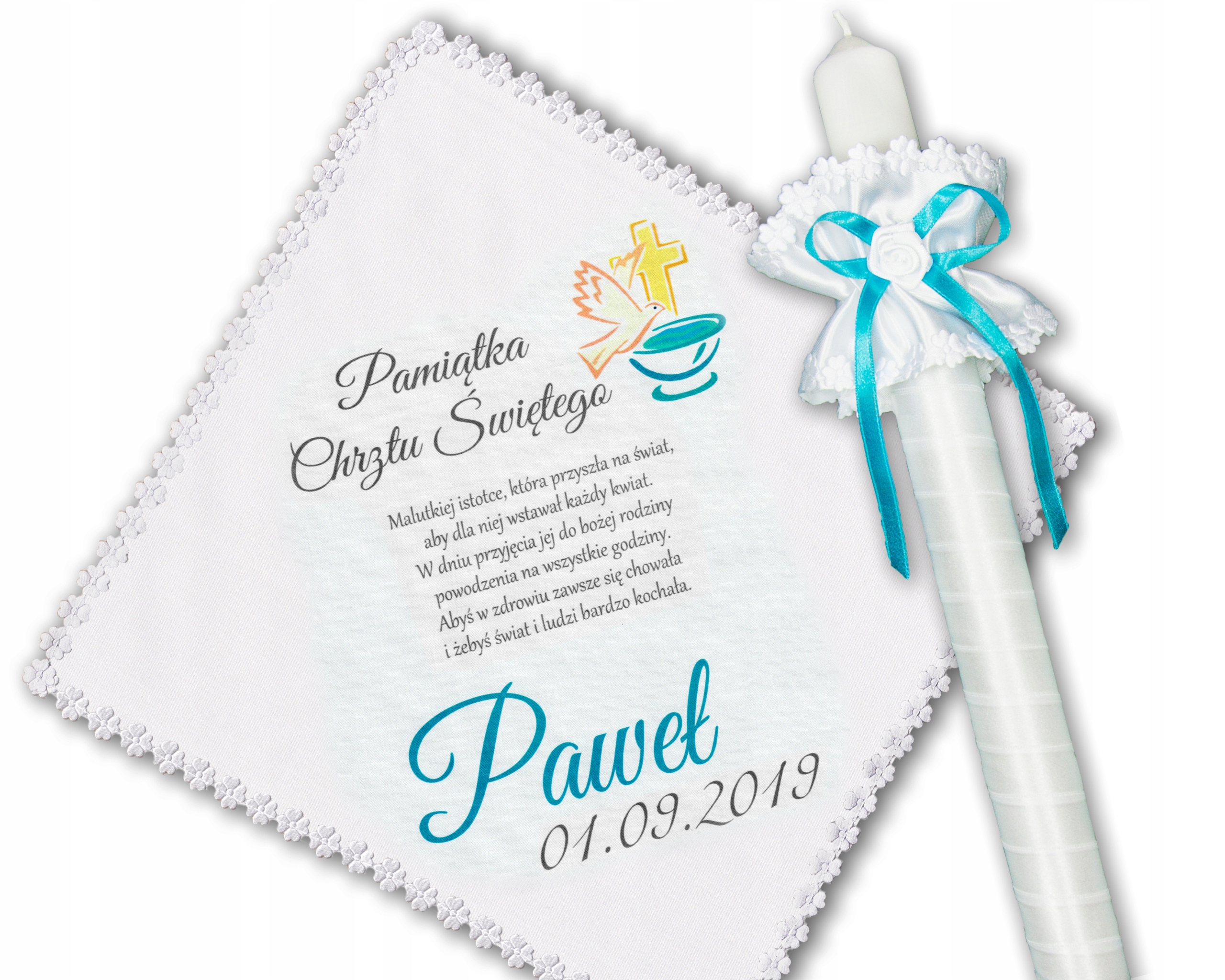 Изящная белая свеча с украшением (совершенством) под цвет халата, крестильный шрифт и имя ребенка бирюзового цвета на футболке. Идеальная модель как для девочек, так и для мальчиков.