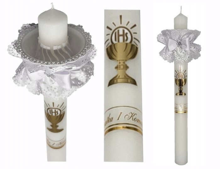 СВІЧКА ПЕРШОГО ПРИЧАСТЯ З ПРОФІТОМ І КАПАЛЬНИКОМ, БІЛА, ЗОЛОТА СМУЖКА