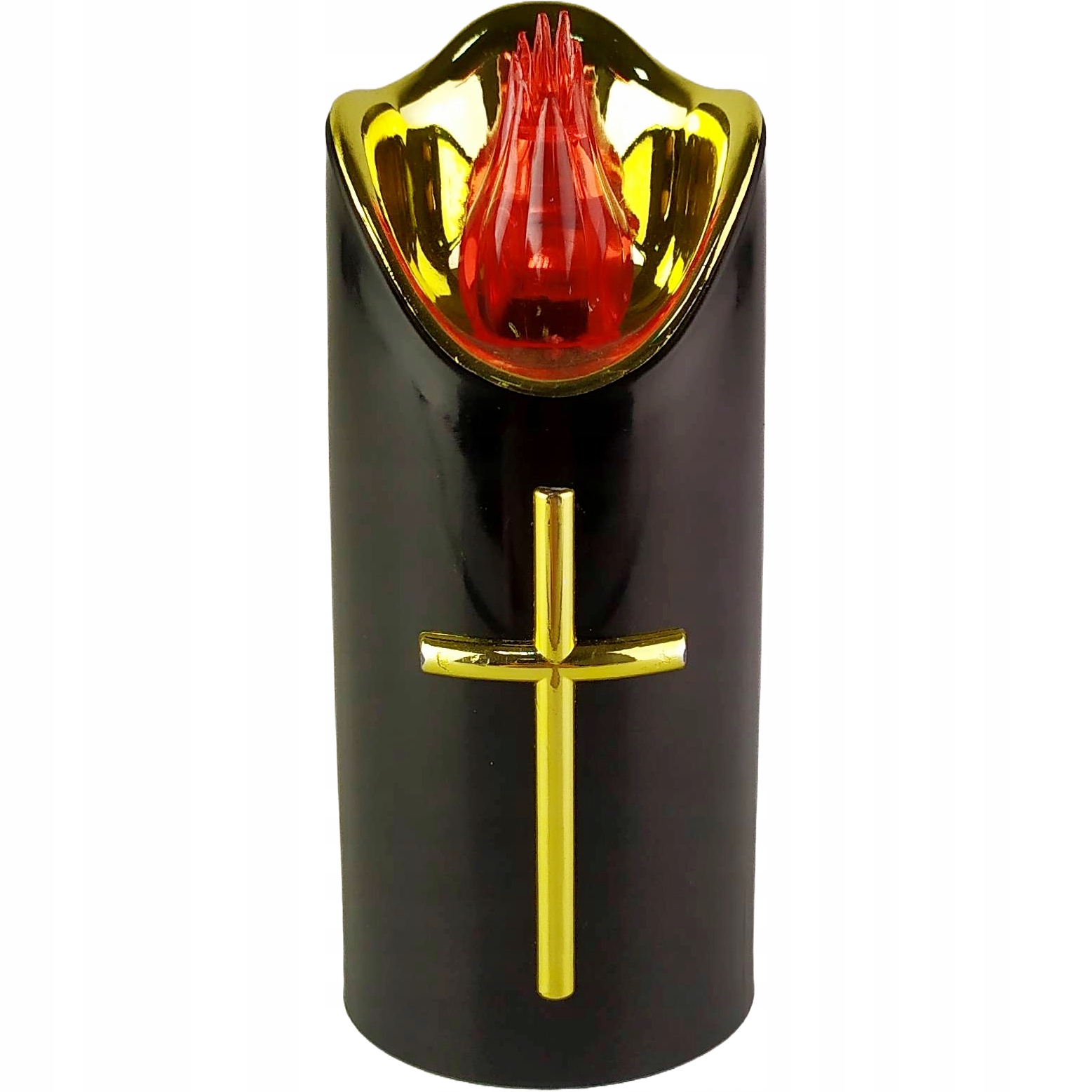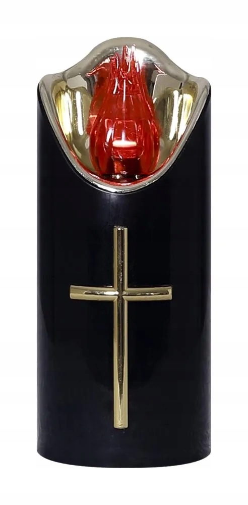 Черная светодиодная свеча с золотыми акцентами и крестообразной аппликацией, красный цвет свечения. Символическое оформление изделия делает его идеальным в качестве наполнителя для всевозможных фонарей, фонариков или свечей и даже как самостоятельное украшение могилы близких.