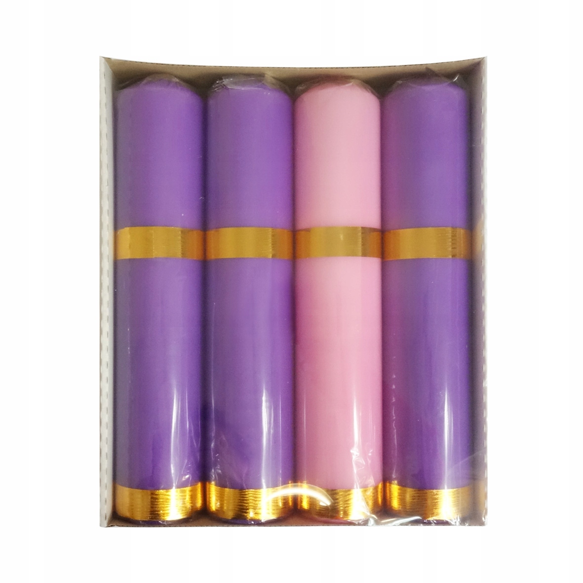 В комплект входят три фиолетовые свечи и одна розовая свеча, украшенная элегантной золотой лентой. Набор прекрасно подойдет в качестве свечей для традиционного адвентского венка, а также как элемент рождественских декоративных композиций.