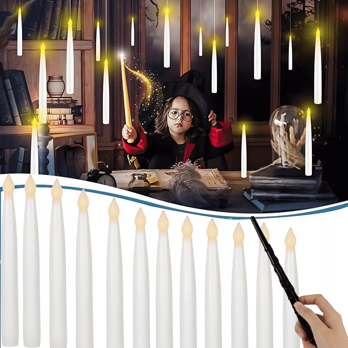✨【Волшебные эффекты и атмосферная атмосфера на Хэллоуин и Рождество】 Сочетание пульта дистанционного управления с волшебной палочкой и плавающих свечей создает чарующую атмосферу. Этот источник света создает волшебную атмосферу, идеальную для Хэллоуина, Рождества и других торжественных случаев. Погрузите свой дом в мистическую и чудесную атмосферу.
