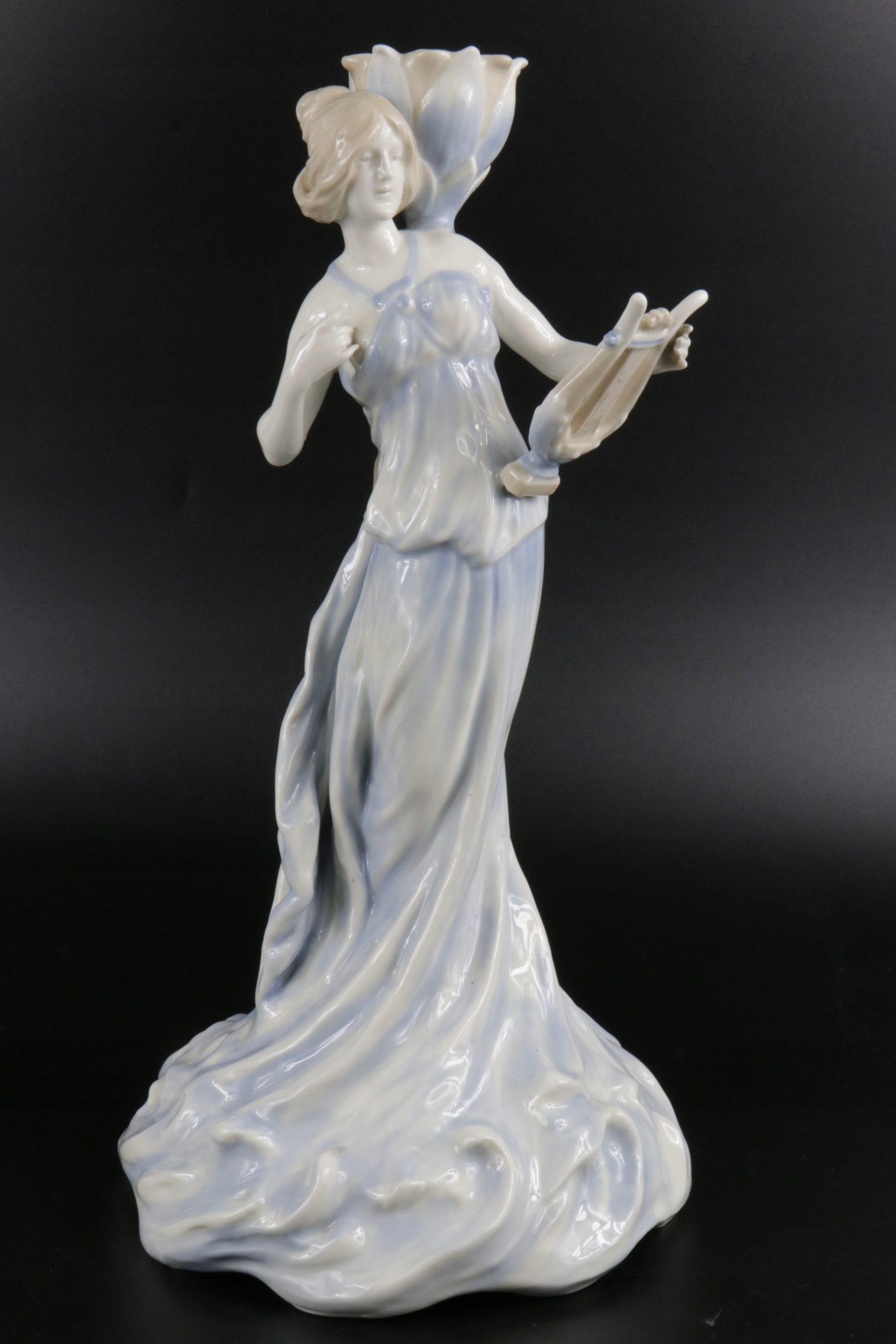 Фарфоровый подсвечник в стиле модерн. Фигурная основа выполнена в виде молодой девушки, держащей в одной руке арфу, платье мягко и волнисто ниспадает вниз, создавая широкую основу для подсвечника, принимающего форму морских волн. Глазурованный фарфор, ручная роспись, цифровая подпись. По-моему, австрийский фарфор, возможно, Амфора.