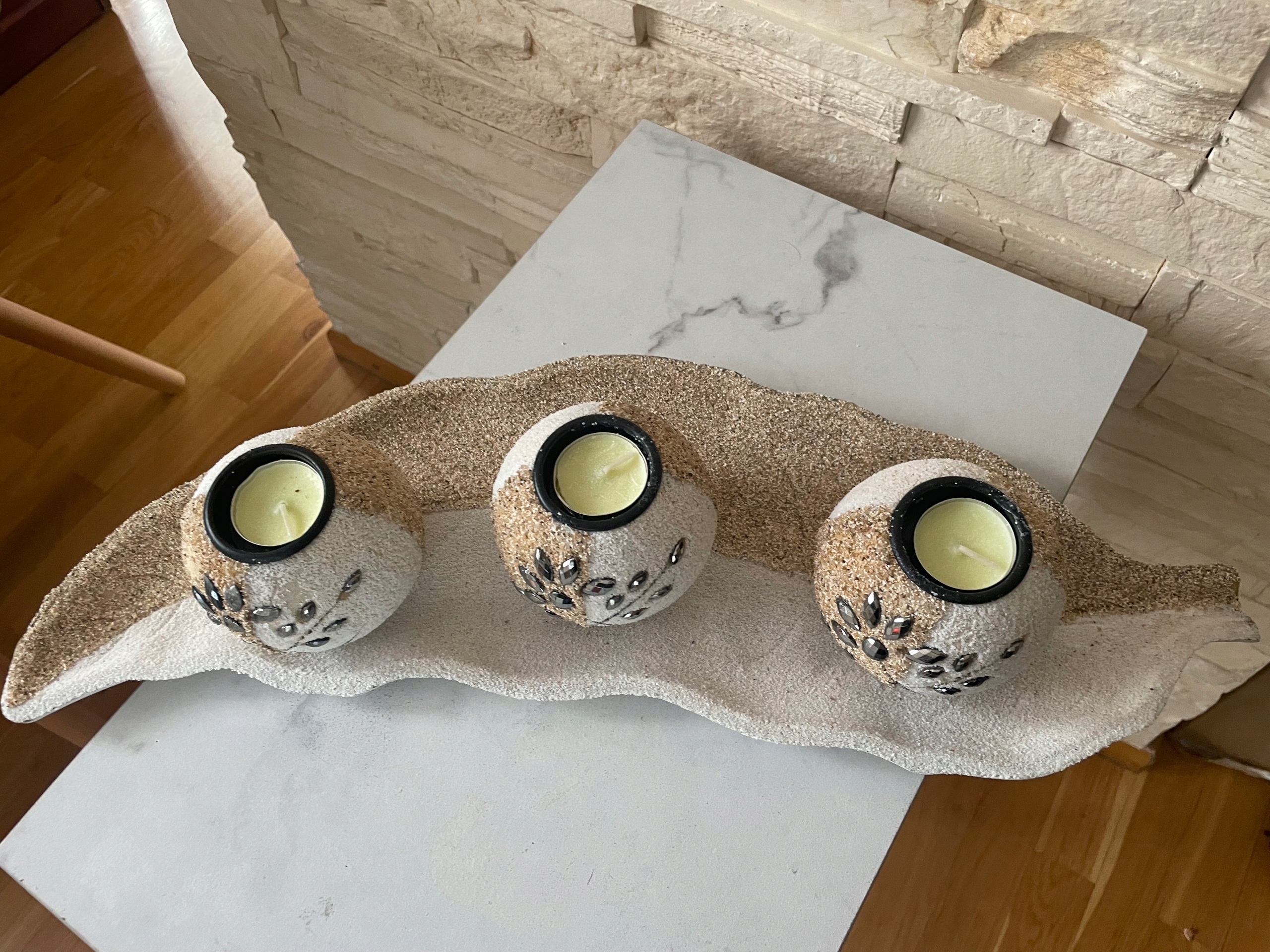 Наши декоративные настольные подсвечники понравятся любителям пляжного отдыха. Основание и подсвечники имеют интересную песочную поверхность, а камни светлых тонов дополняют естественный дизайн подсвечника. Наши круглые подсвечники имеют растительный мотив с блестящими элементами, что придает этому комплекту элегантность. Зажженные подсвечники мгновенно создадут романтическую атмосферу в вашей комнате. Длинная подставка в форме листа будет красиво демонстрировать светящиеся шарики. Наше стильное украшение лучше всего смотрится на столе или комоде.