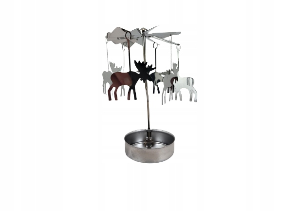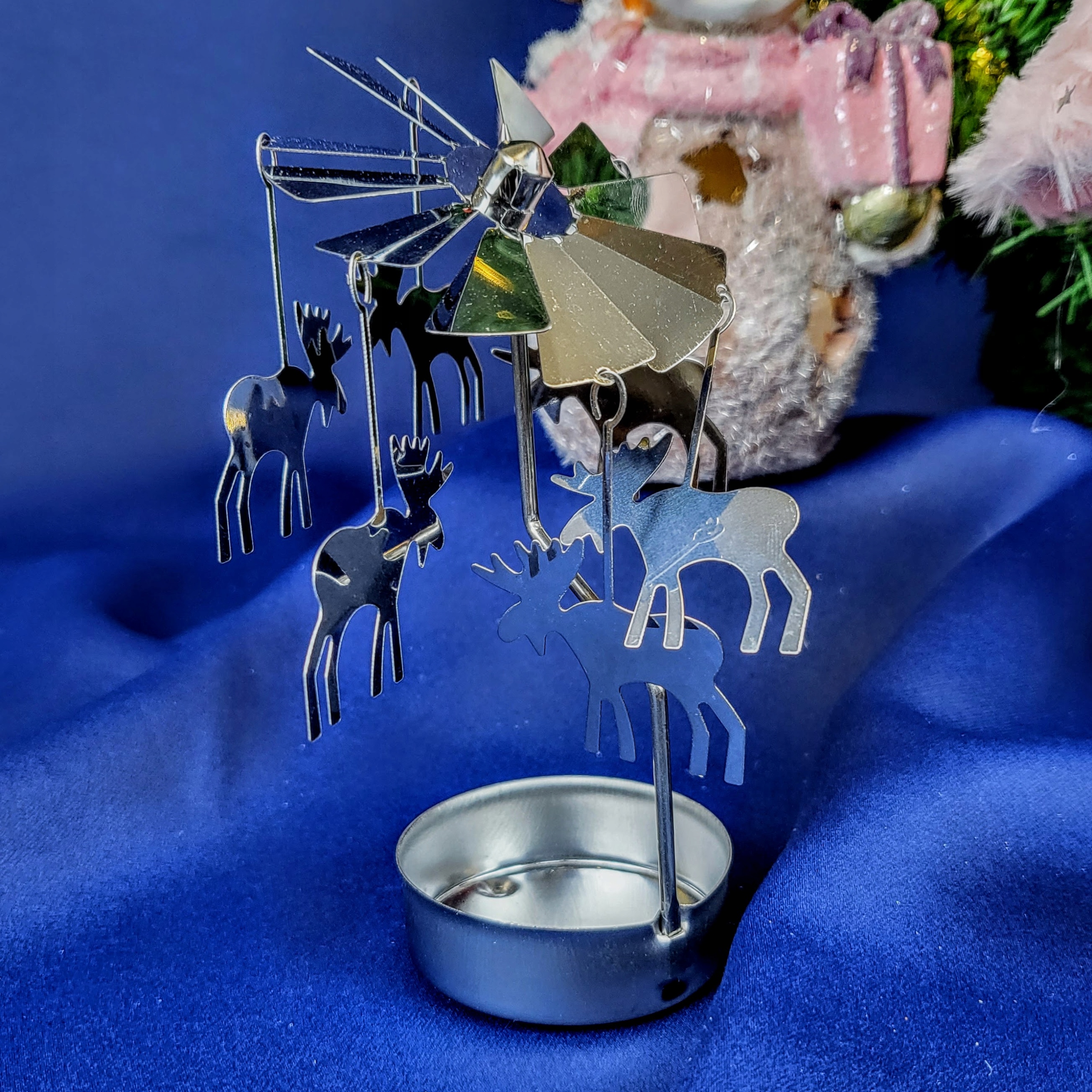 Вращающийся подсвечник в виде оленя. Оснащен шестью оленями на эстетичной подвеске, которая вращается вокруг своей оси. Подвески вращаются автоматически под воздействием тепла зажженной свечи. Блестящие пластины отражают свет свечи. Возможность размещения на ровной поверхности делает подсвечник прекрасным украшением праздничного сезона.