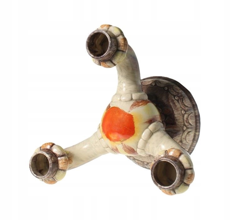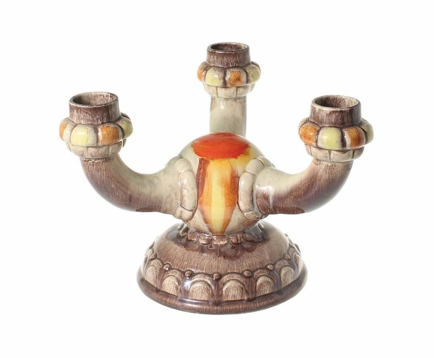 Глазурный подсвечник на три свечи в оттенках коричневого, белого, желтого и красного. Происхождение неизвестно. По стилю модели видно, что она изготовлена в 1950-1960-е годы.