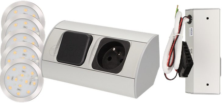 МЕБЕЛЬНАЯ РОЗЕТКА 1x230В + ВСТРОЕННЫЙ ВЫКЛЮЧАТЕЛЬ БЛОКА ПИТАНИЯ СВЕТОДИОДОВ, 5 СВЕТОДИОДНЫХ СВЕТИЛЬНИКОВ В КОМПЛЕКТЕ!