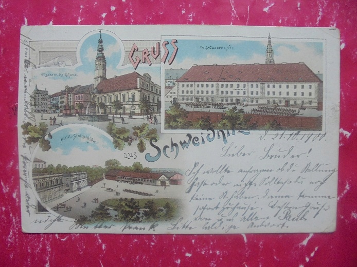 СВИДНИЦА ШВЕЙДНИЦ СВЕБОДЗИЦЕ ВАЛБЖИХ ЛИТОГРАФИЯ КАЗАРМЫ № 2 АПЕЛЛЯЦИОННАЯ ПЛОЩАДЬ РЫНОЧНАЯ ПЛОЩАДЬ РАТУША ИЗ ОБРАЩЕНИЯ 21.10.1900 СОСТОЯНИЕ КАК НА СКАНИРОВАНИИ МИНУС ОТКРЫТКА АККУРНО ОБРЕЗАНА С ПРАВОЙ СТОРОНЫ КРАСИВАЯ ОТКРЫТКА ИЗ ЭПОХИ ВОЗМОЖНОСТИ ОПЛАТЫ ТРАДИЦИОННЫМ ПЕРЕВОДОМ BANK SLĄSKI ВНИМАНИЕ МАЛЕНЬКИЙ ФОРМАТ ОТКРЫТКИ