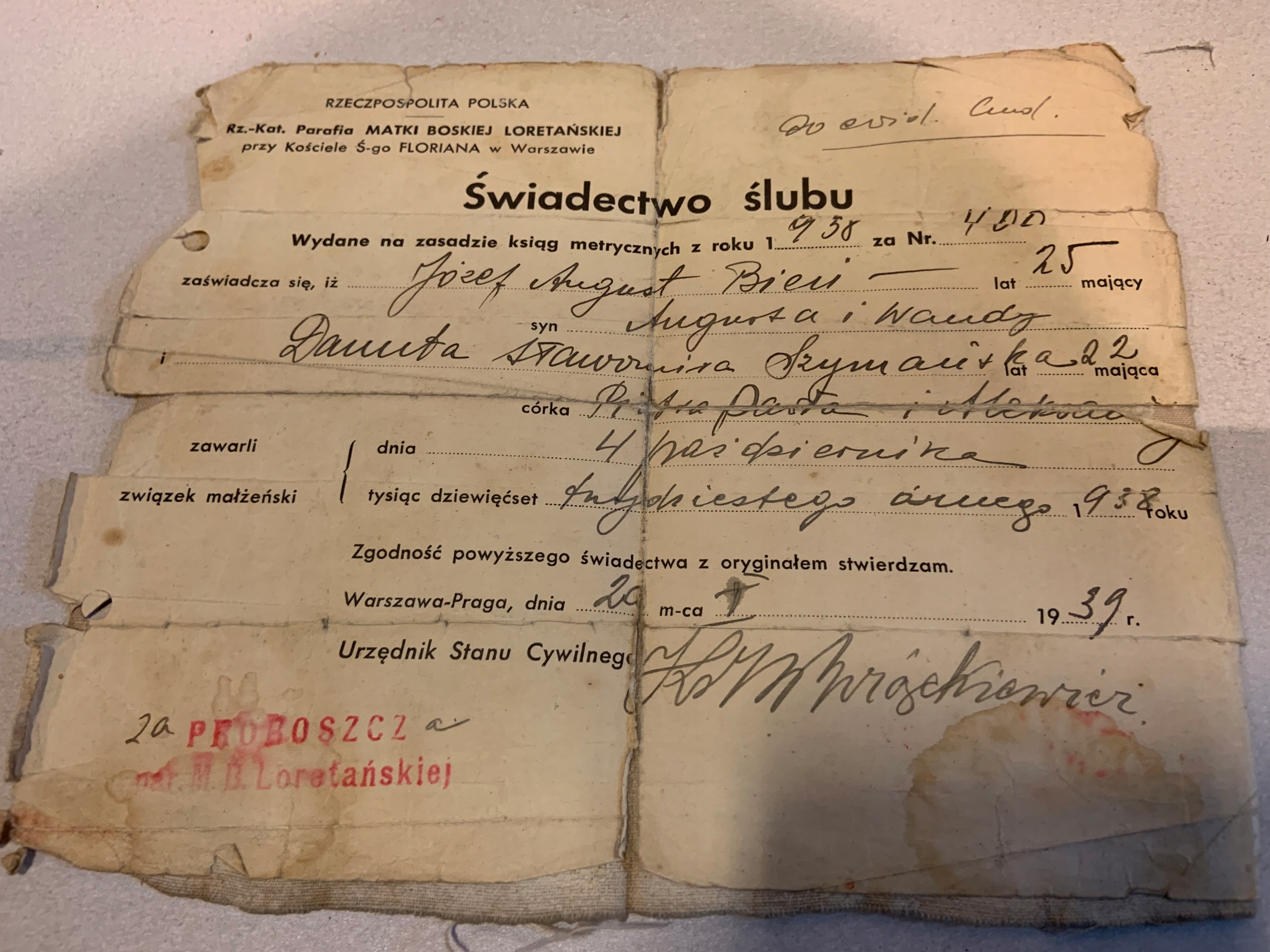 СВІДОЦТВО О ВЄСІЛІ ВАРШАВА ЦЕРКВА ФЛОРІАНИ 1939р