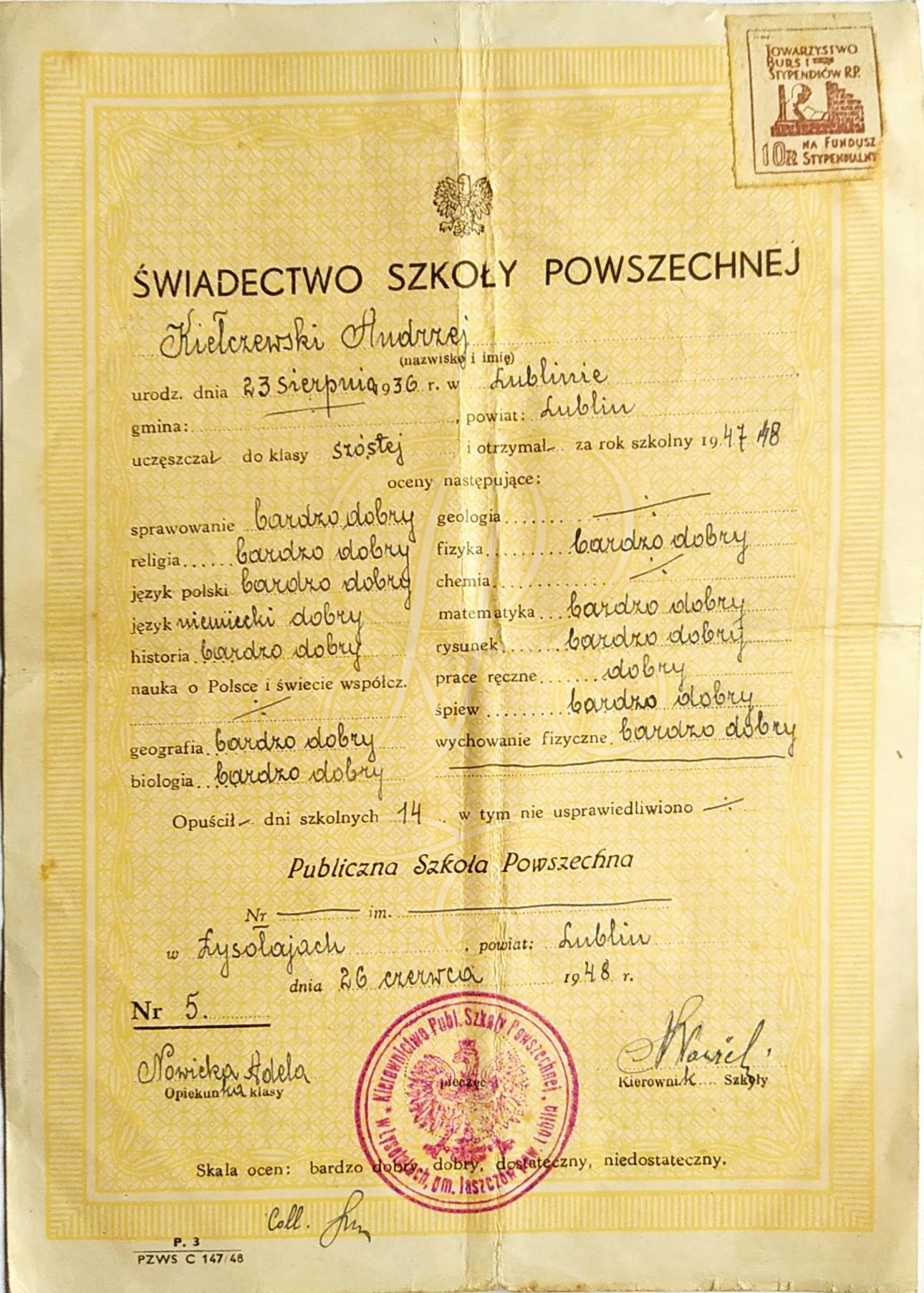 СВІДОЦТВО ПРО ПОЧАТКОВУ ШКОЛУ - ŁYSOŁAJE 1948
