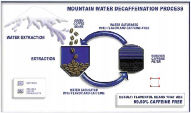 Ледниковая вода, стекающая с вулкана, чистая – без физических и химических примесей, насыщена минеральными соединениями, содержащимися в кофе. Это первая стадия декофеинизации. Ему предшествует лабораторное тестирование партии поставляемого зеленого кофе. Результаты этих испытаний позволяют обеспечить соответствующее насыщение воды конкретными минеральными соединениями в соответствующих концентрациях. Так готовится каждая порция воды, которая затем используется в процессе, для конкретной партии и сорта кофе.