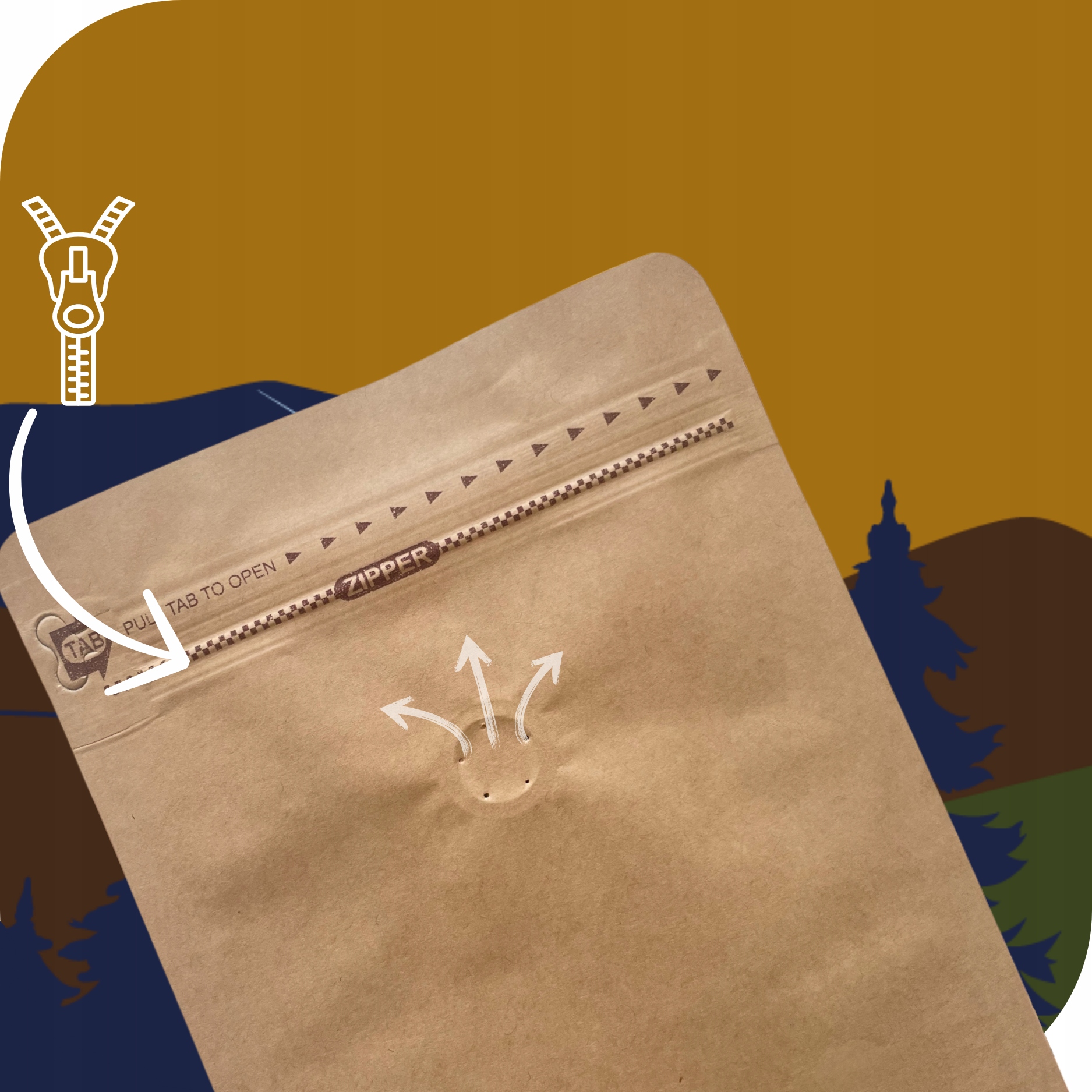 Наша упаковка изготовлена из бумаги и содержит клапан, обеспечивающий постоянный доступ кислорода к кофе. Таким образом, газы, образующиеся в процессе курения, могут свободно выходить.