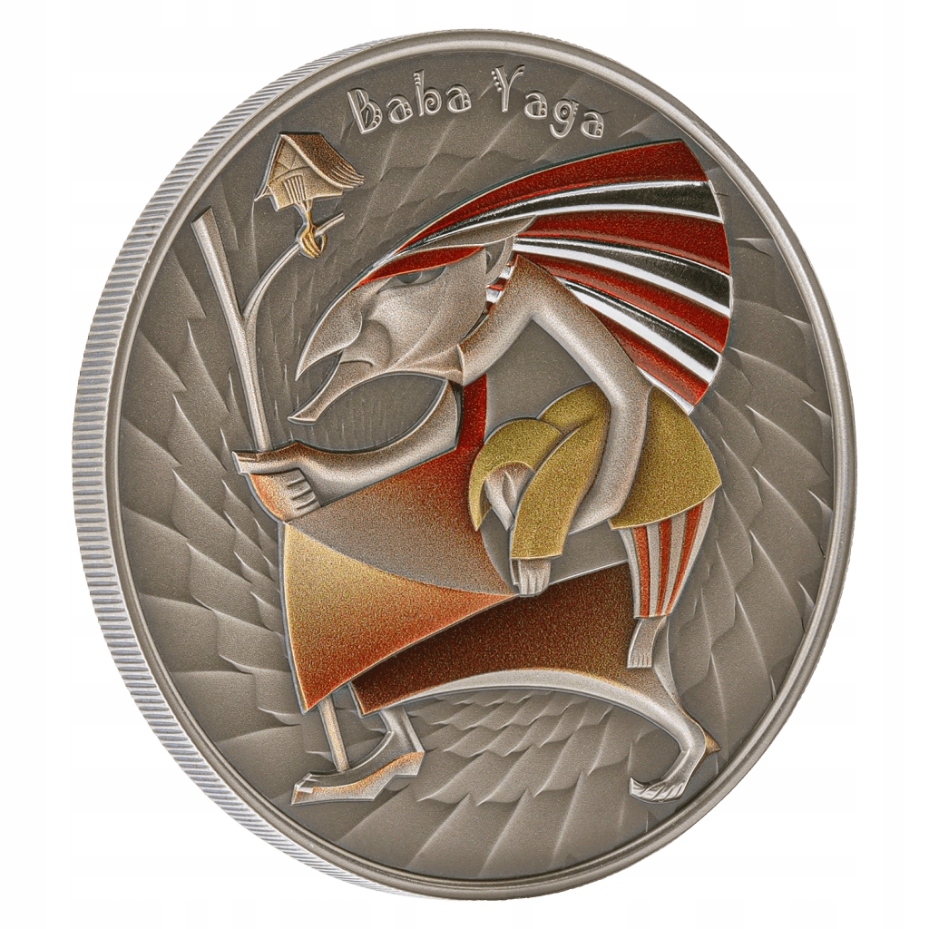 Основным мотивом монеты является Баба Яга – персонаж славянской мифологии. В легендах эту старуху обычно изображали злой, могущественной ведьмой или демоном, целью которого было похищать детей, охотиться на людей и сеять страх и хаос. Баба Яга живет в избушке, которая стоит на куриной ножке, окруженной забором из человеческих костей.