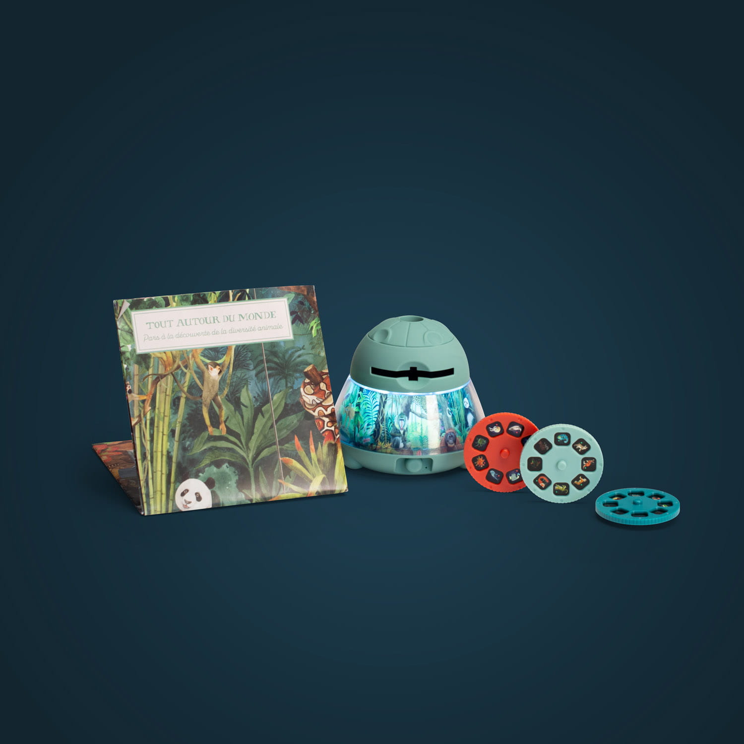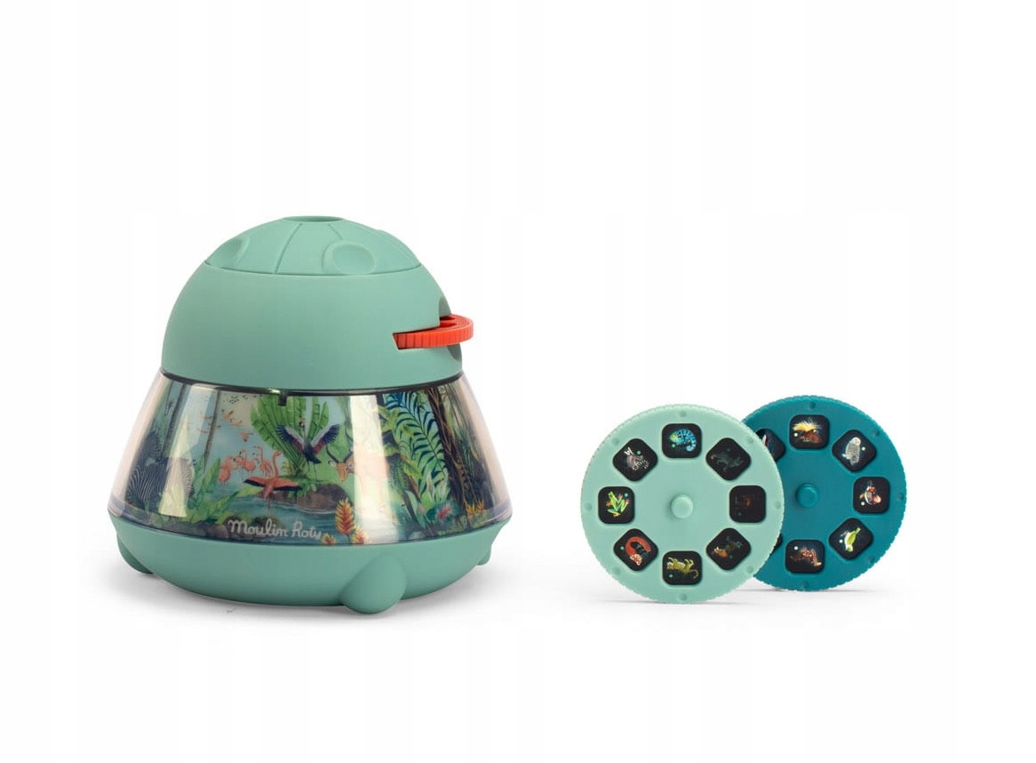 Мы узнаем животных мира, благодаря проектору лампы от Moulin Rota! Набор включает в себя 3 диска со слайдами (8 на один), которые следует помещать в лампу и направлять изображение на гладкую стену в темной комнате. Земля, вода и животные, живущие в небе, ждут открытия!