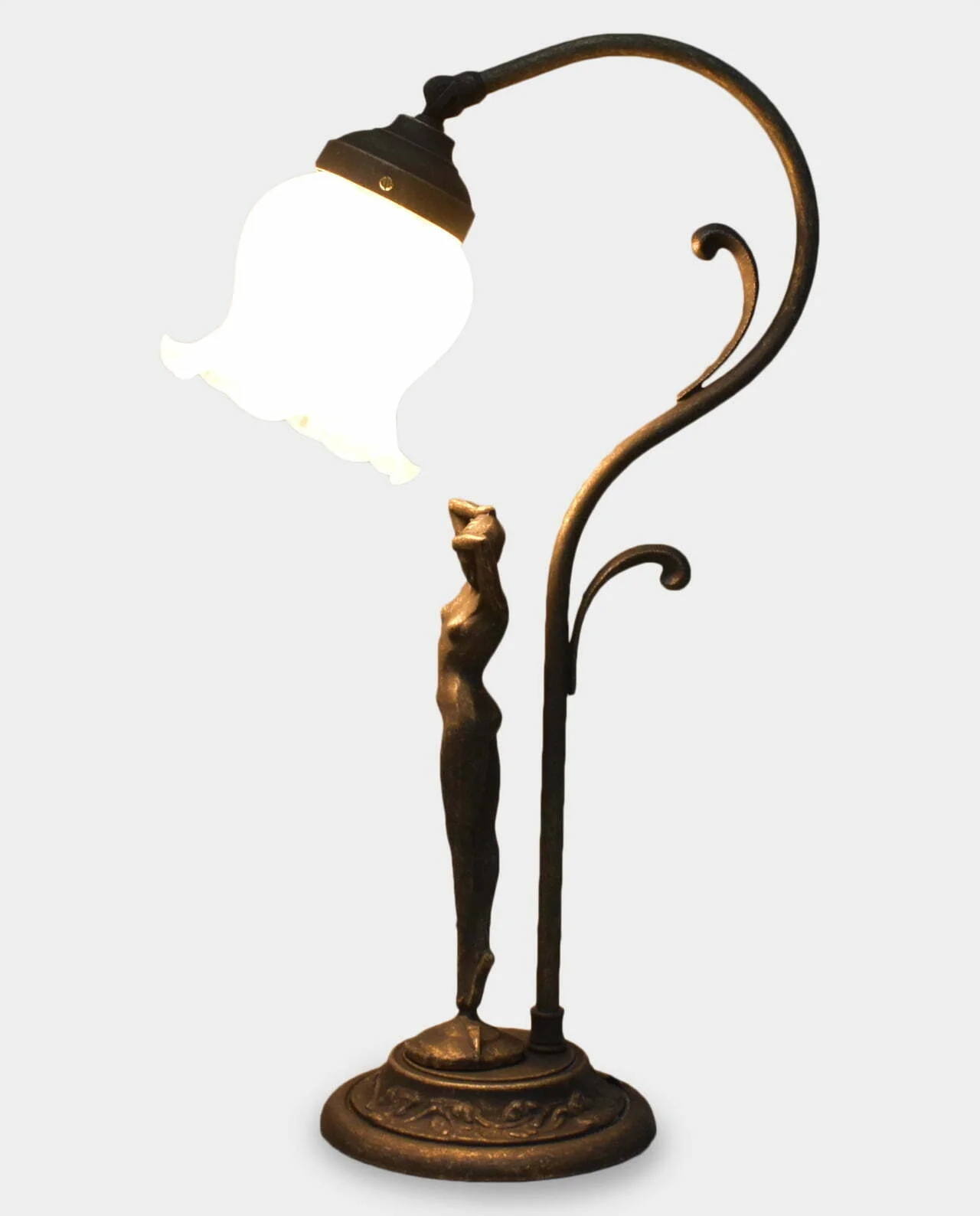 Светильник в стиле ар-деко с абажуром из белого стекла в форме колокольчика. Основа изготовлена из латуни, состарена и украшена фигуркой женщины. Он прекрасно дополнит интерьер спальни и придаст индивидуальности гостиной или кабинету. Придайте своему дому новый, неповторимый стиль и заставьте всех восхищаться этой прекрасной деталью декора! Идеальное украшение для вашего дома, офиса и многого другого!