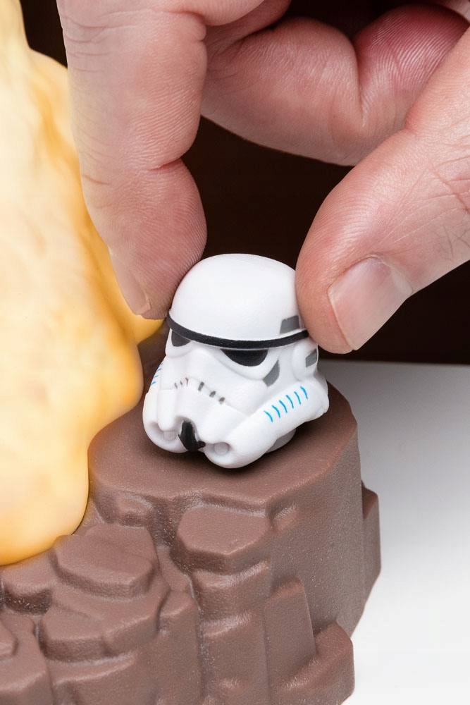 Благодаря своему уникальному дизайну он придает обстановке невероятный шарм и атмосферу. Идеально подходит для дизайна интерьера каждому поклоннику вселенной «Звездных войн», как старшему, так и младшему. Он характеризуется очень точным отражением, а свет исходит непосредственно от дыма реактивного ранца. Лампу можно включать и регулировать яркость благодаря специальной кнопке в форме шлема штурмовика. Имеет три режима освещения.