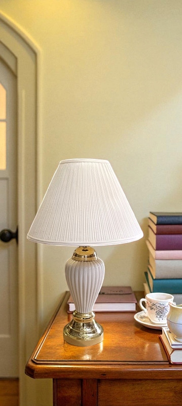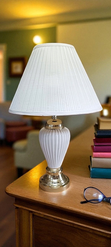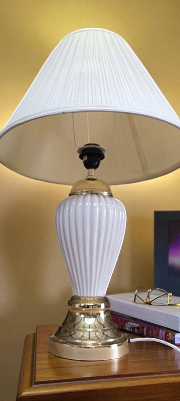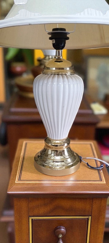 Лампа б/у и в очень хорошем состоянии. Изготовлен из золота и керамики цвета экрю, абажур цвета экрю. Привезено из Франции; очень декоративен - состояние очень хорошее.