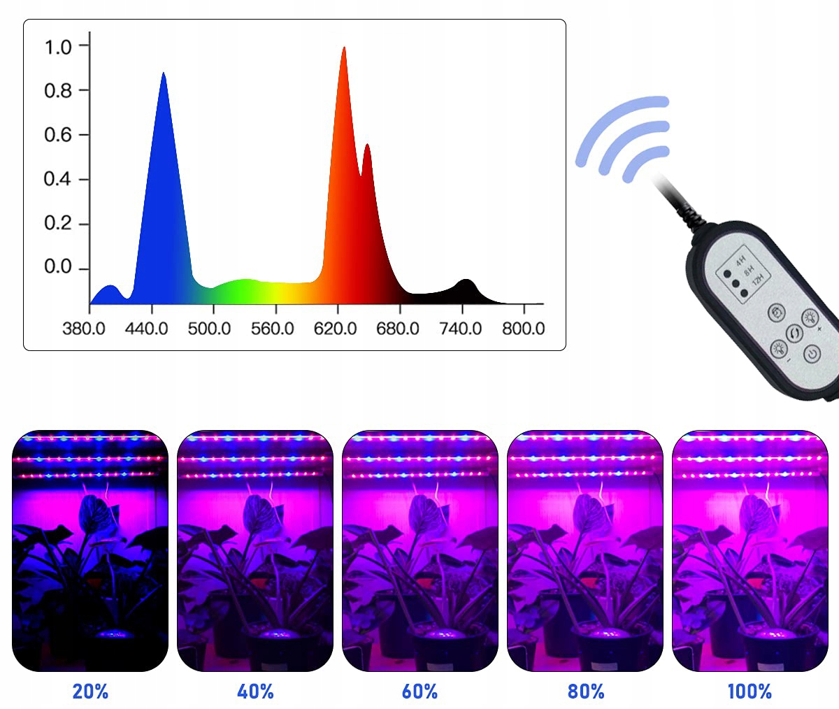 380-780 нм — полный спектр света от ультрафиолета до инфракрасного, который поддерживает все фазы роста растений, от прорастания до цветения.