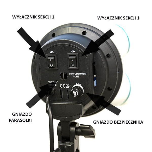 Софтбокс рассчитан на работу с четырьмя лампочками (входят в комплект) максимальной мощностью 85 Вт каждая. Софтбокс позволяет поэтапно регулировать мощность путем включения/выключения пар лампочек (два переключателя): 0%-50%-100%. Комплект крепится к осветительным стойкам с помощью встроенной ручки, позволяющей осуществлять любую регулировку угла наклона.