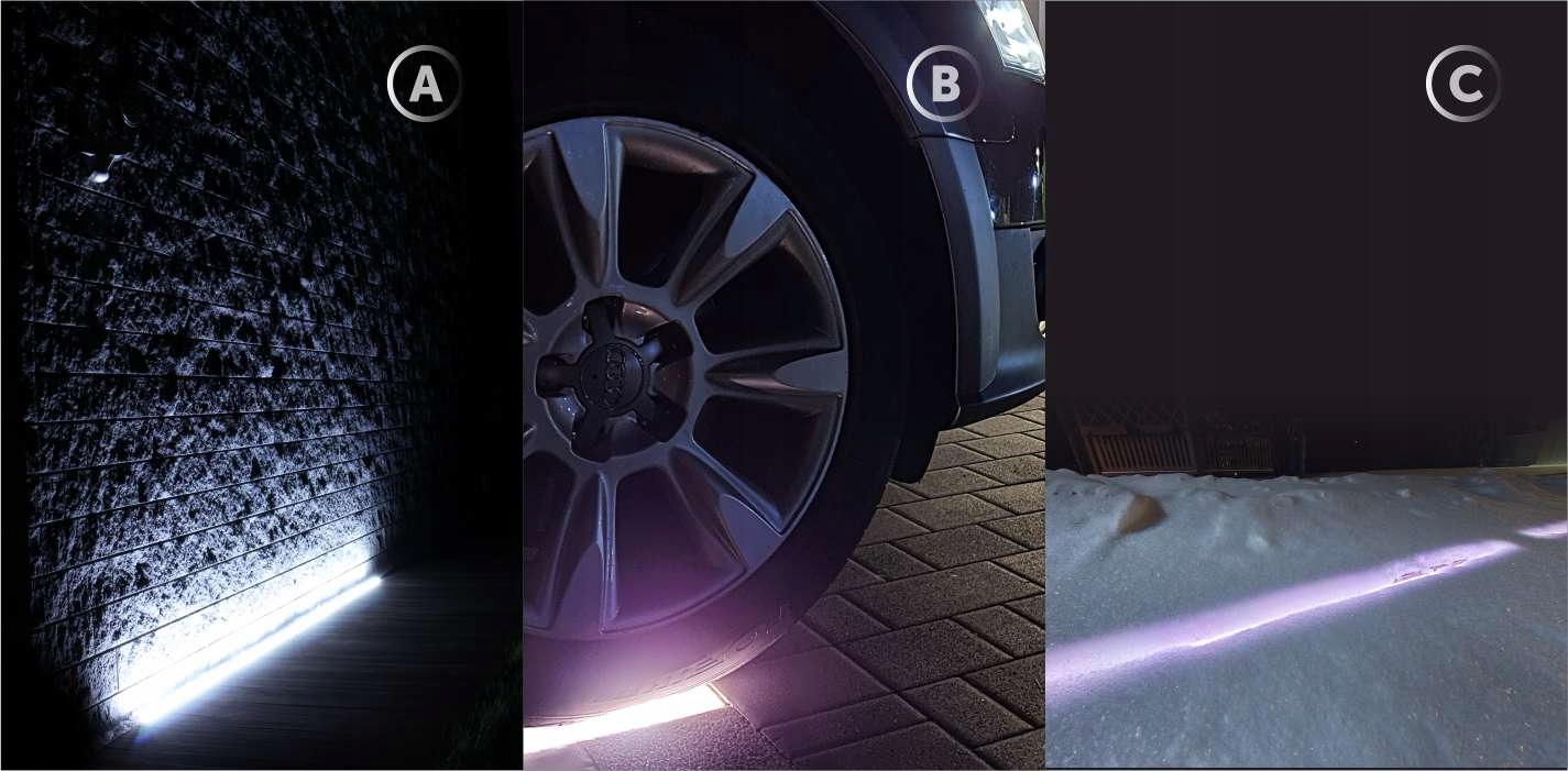 - Фото C - Светильники LedBruk® характеризуются высокой устойчивостью к перепадам температур и влаге (герметичность IP68 >) и воздействию дорожной соли. На фото заснеженная обстановка.