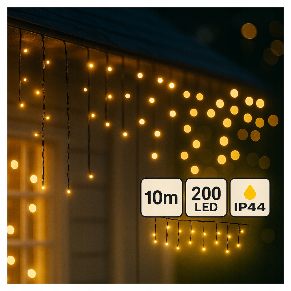 Светильники светодиодные – Сосульки 10 м | 200 диодов | Теплый белый | IP44 | Для дома и на природе