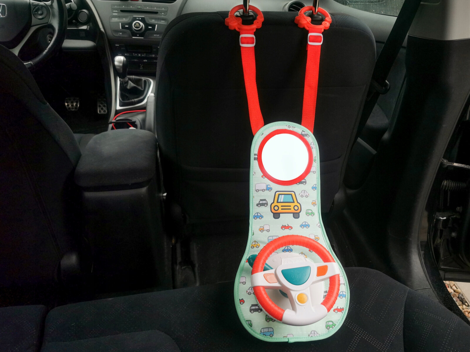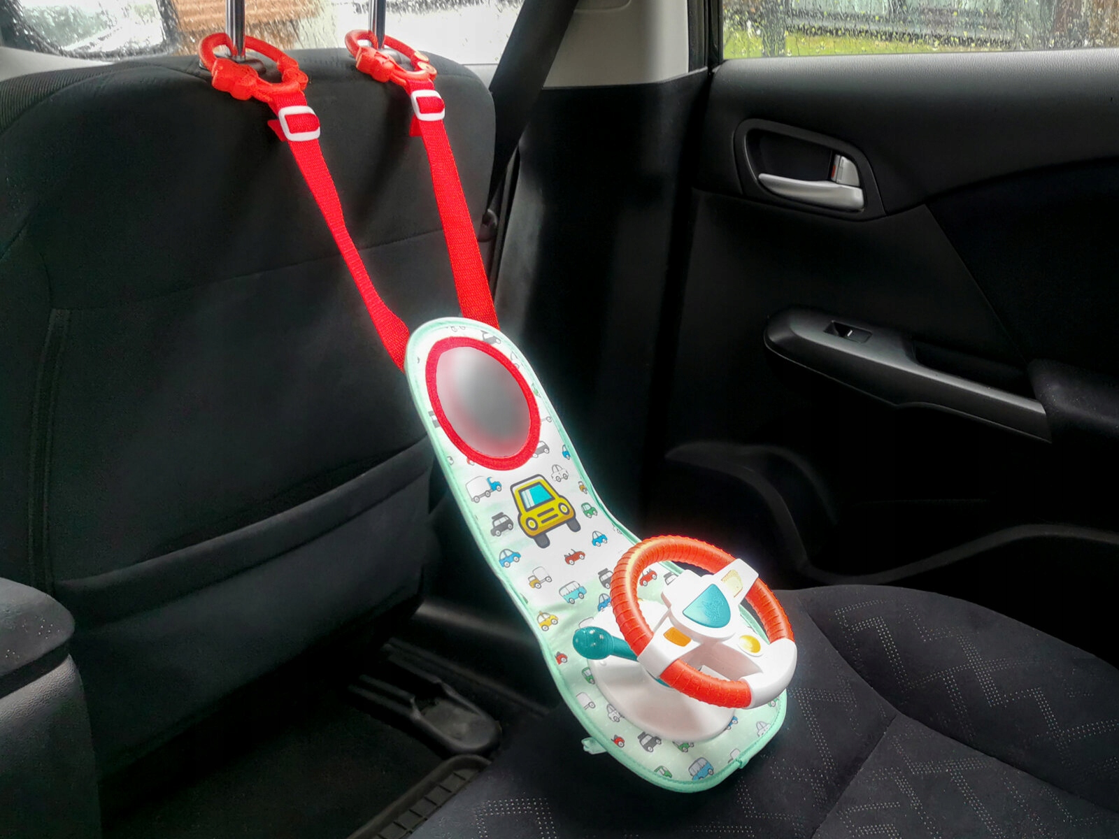 Прикрепить рулевое колесо к подголовнику автокресла очень просто. Просто прикрепите его с помощью колец, расположенных на регулируемых ремнях. Игрушка также является идеальной альтернативой подражанию родителю во время вождения.