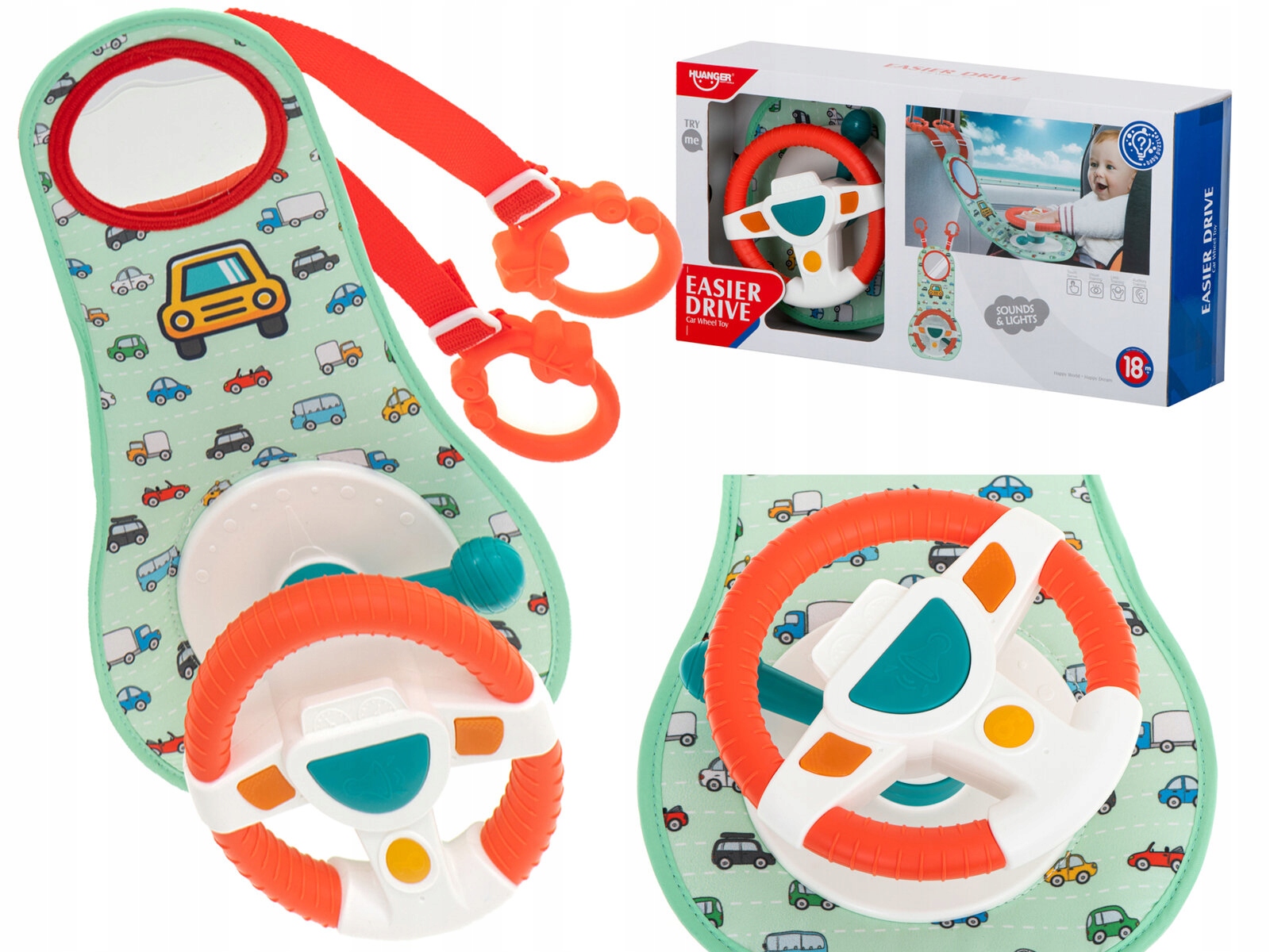 Оснащен 4 кнопками с сенсорной ручкой и защитным зеркалом. Элементы размещены на жестком основании, которое обтянуто тканью с игрушечными машинками. Кнопки на рулевом колесе загораются и издают следующие звуки: