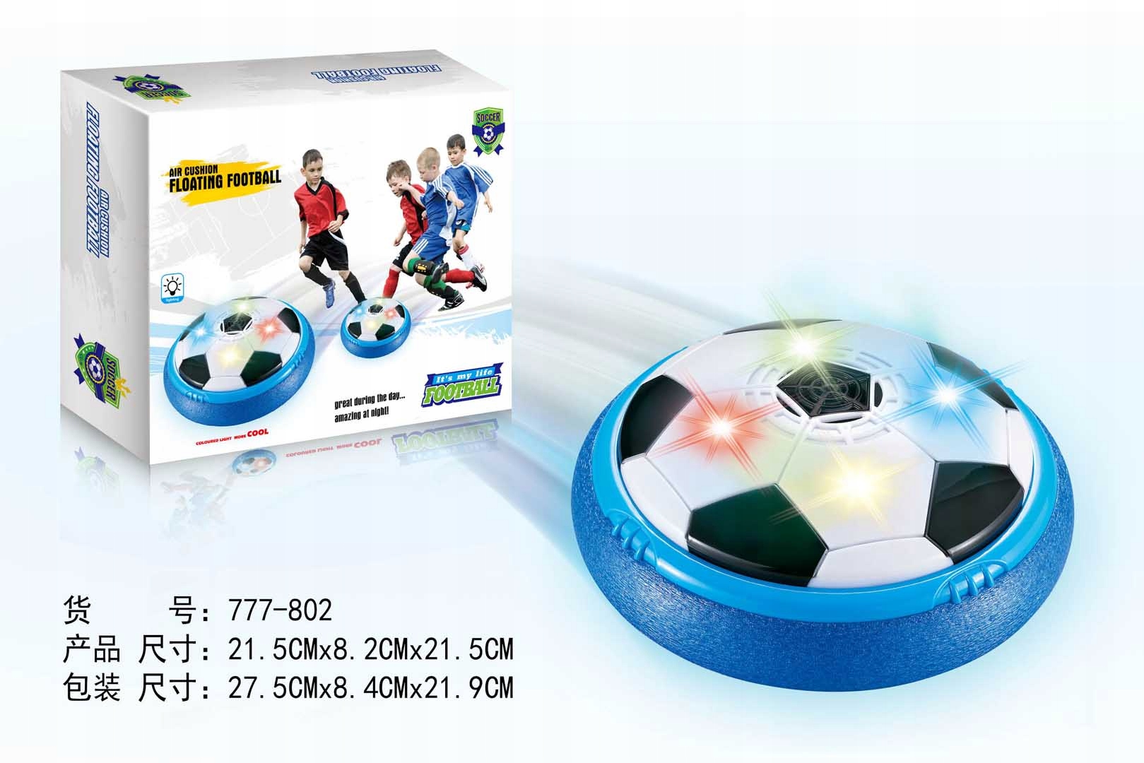 Футбол с эффектом света для детей от 3 лет. Мяч питается на 6 x AA 1,5 В батарей (не входит в комплект). После включения его, он имеет легкий воздух снизу, в результате чего мяч поднимается над поверхностью. Кроме того, мяч имеет освещение.