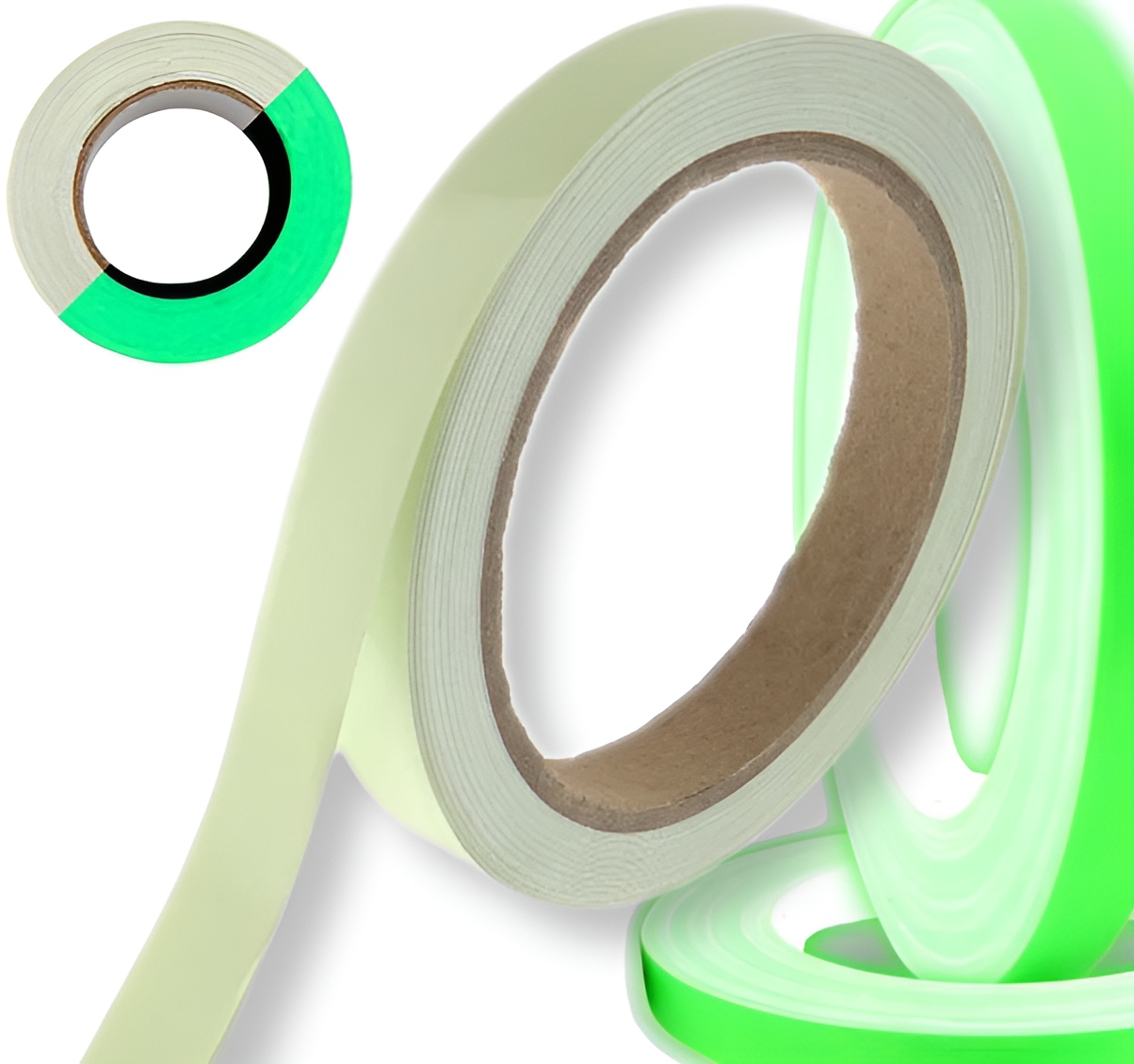 Лента люминесцентная - светится в темноте при воздействии дневного или искусственного света. Светится. до 6 часов после выключения света. В катушке находится 5 метров ленты шириной 1 сантиметр.