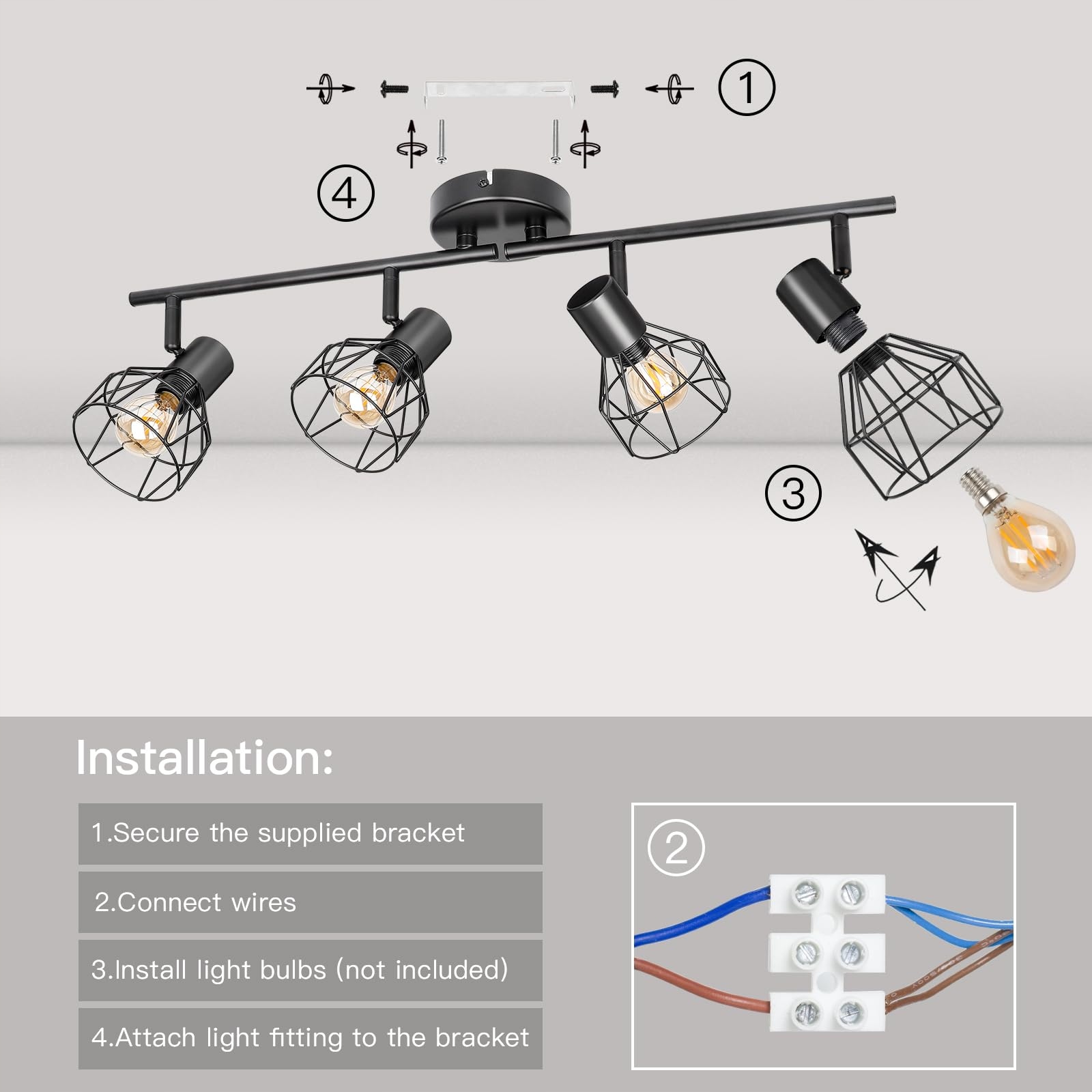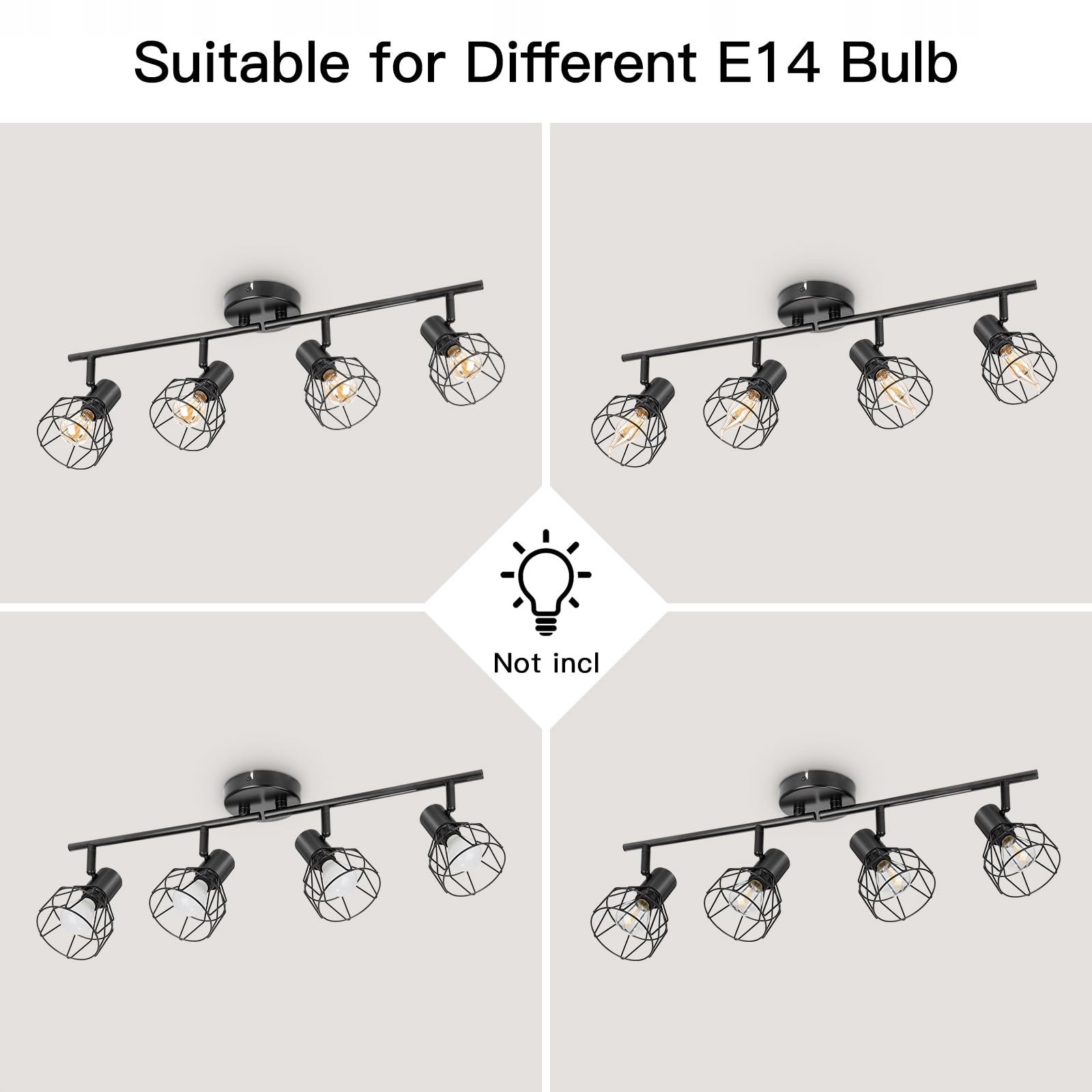 - 【Трековый светильник в стиле ретро с цоколем E14】 Предназначен для использования с лампами с цоколем E14 мощностью до 40 Вт (приобретаются отдельно). Напряжение: 220В-240В. В комплект поставки входит один комплект потолочных точечных светильников с четырехсторонним освещением и монтажные аксессуары.