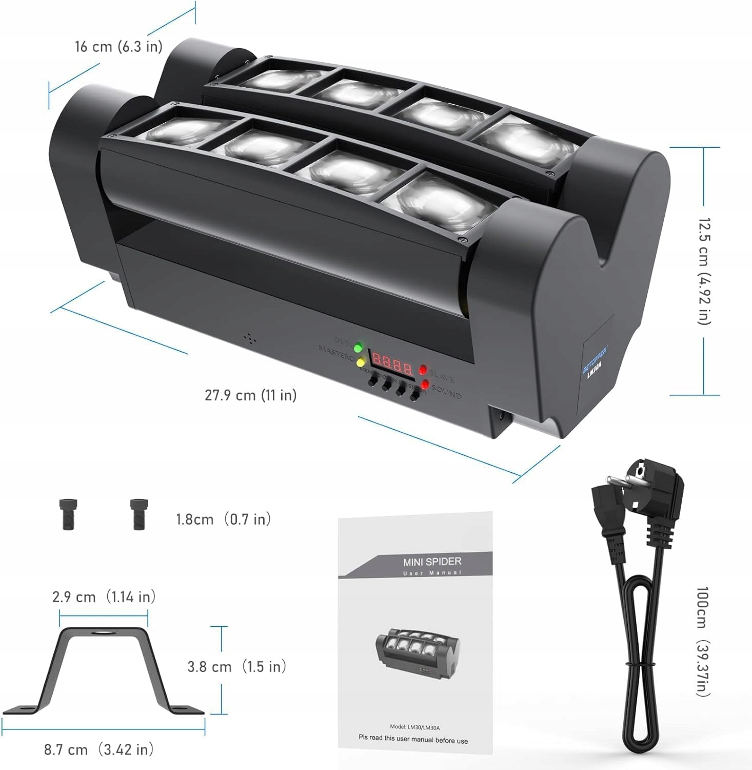 - 【Идеальное освещение сцены】Размеры: 28 x 16 x 12,5 см (Д x Ш x В). Свет сцены оснащен 8 независимыми светодиодными источниками света, двигатель вращается на 60–150°, каждый луч может создавать эффект преследования. Имея до 25 различных режимов освещения, вы сможете в полной мере насладиться выступлением на сцене.