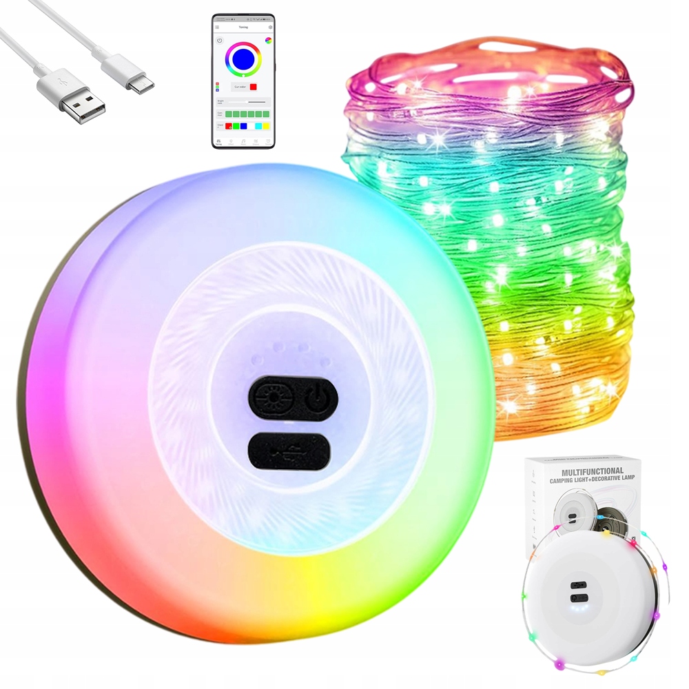 - 🌈Состоит из основного фонаря и световой струны длиной 5,8 м. Основной свет имеет 3 режима: режим высокой яркости, режим низкой освещенности и режим мигания красного света. Световая цепочка также имеет 3 режима: режим постоянного свечения, режим мигания и режим дыхания.