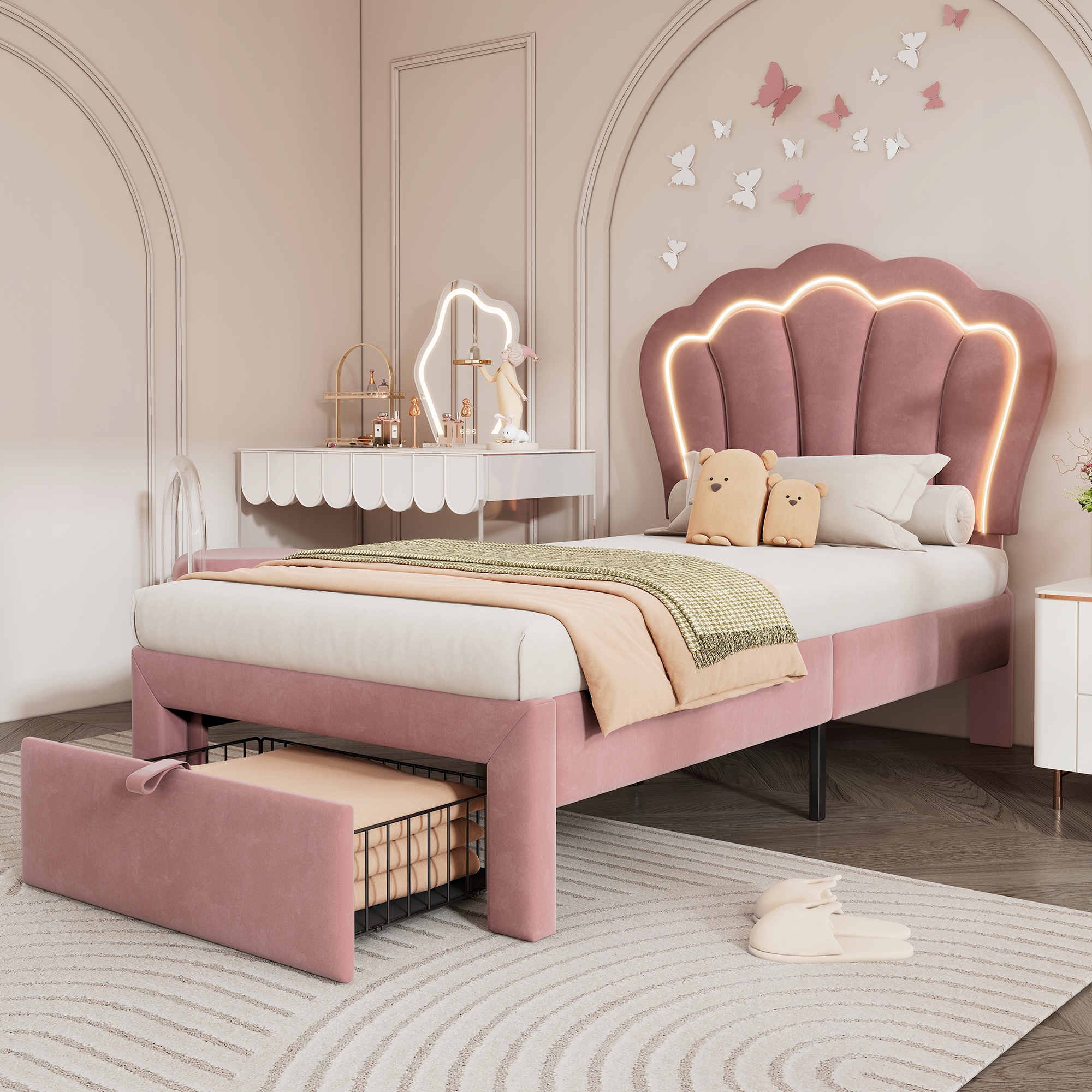 Светодиодная детская кровать 90x190 см, обитая, ящики, приложение, розовый