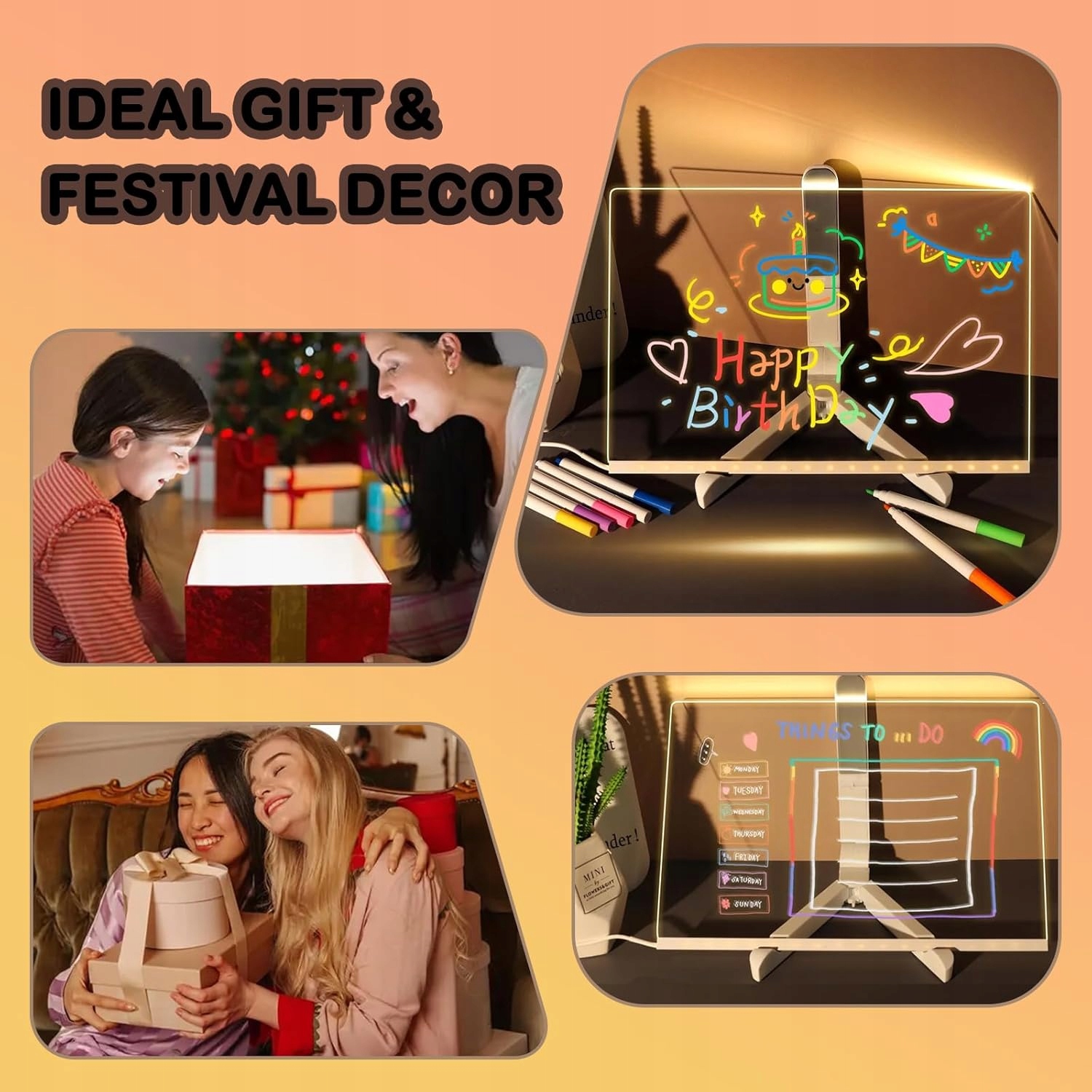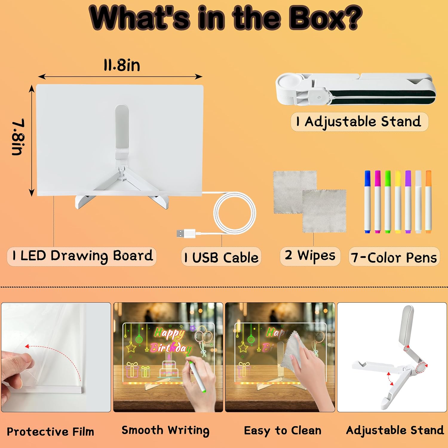 Прозрачная светодиодная доска с 7 цветными маркерами — идеальный инструмент для творческого обучения, планирования и развлечения. Идеально подходит для дома, офиса или кафе как современный способ передачи сообщений. 💡🎨