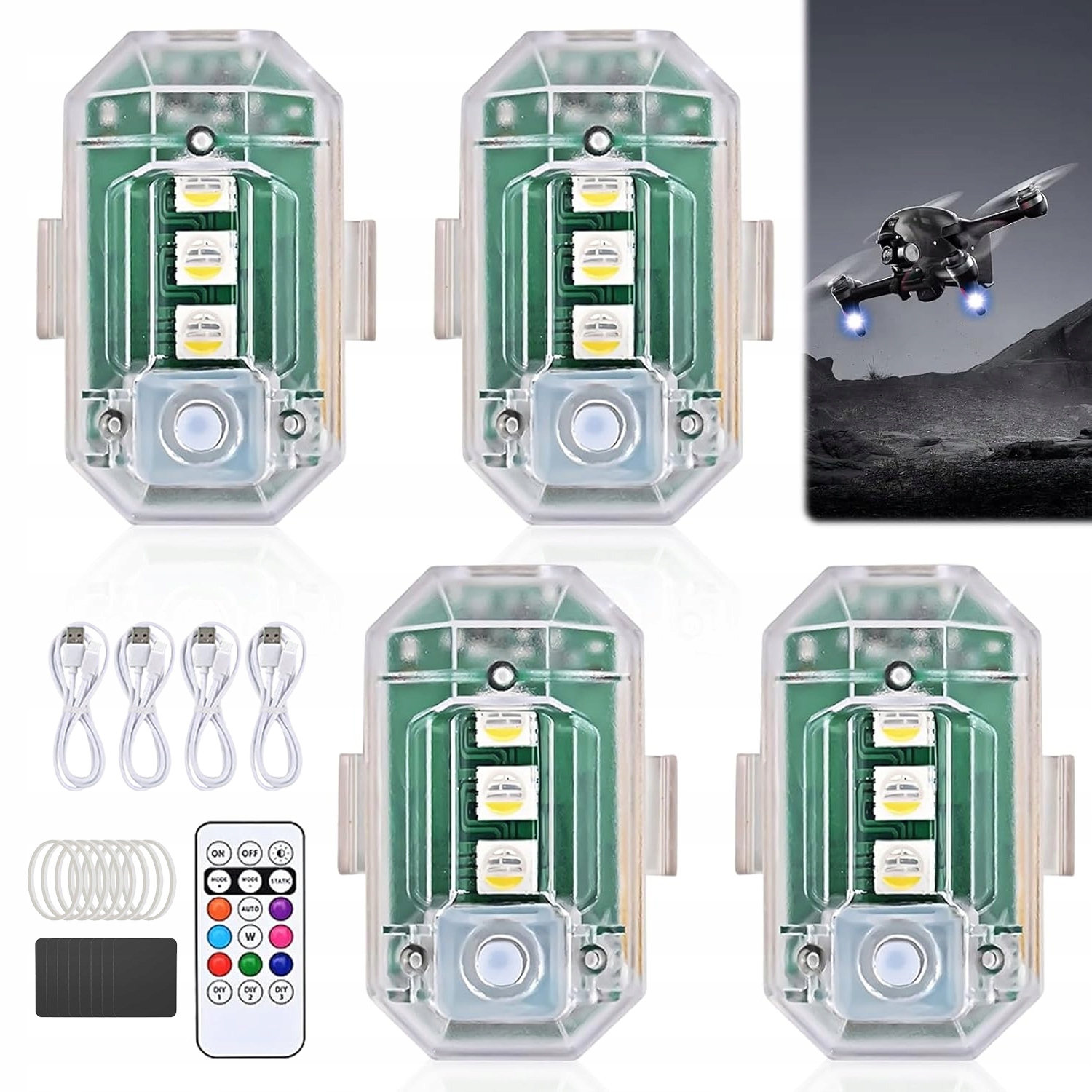 Набор из 4 беспроводных светодиодных стробоскопных ламп для беспилотников с пультом дистанционного управления, зарядной батареи и USB типа C, 8 цветов, лампа с высокой яркости с дронами DJI, автомобилями, грузовиками, мотоциклами, велосипедов и т. Д. H1>
