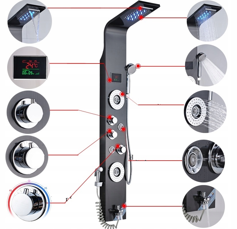 Душевая панель со светодиодной подсветкой с тропическим душем, гидромассажем и многофункциональной насадкой для душа