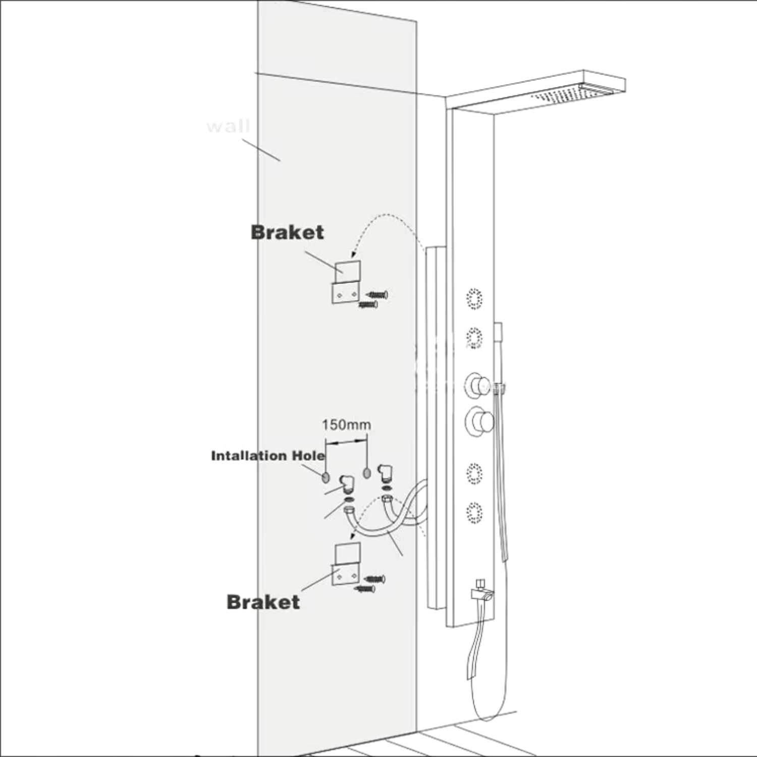 Душевая панель с тропическим душем, гидромассажем и водопадным изливом содержит все необходимые элементы для удобного монтажа.