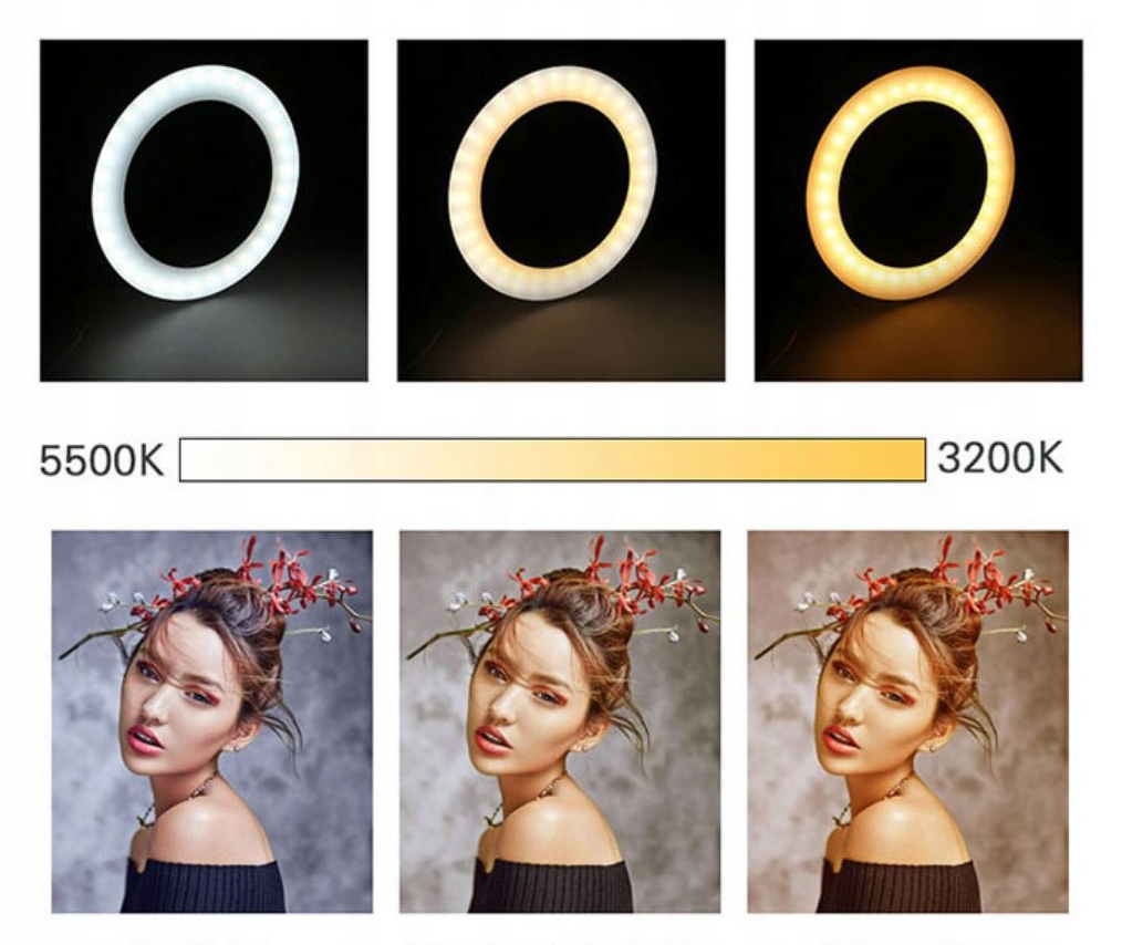 Отличным приложением для регулировкицвета и интенсивности освещения лампы LED RING 80W является двумерная коррекция нежелательные характеристики или недостатки естественного освещения на фотосъемке.