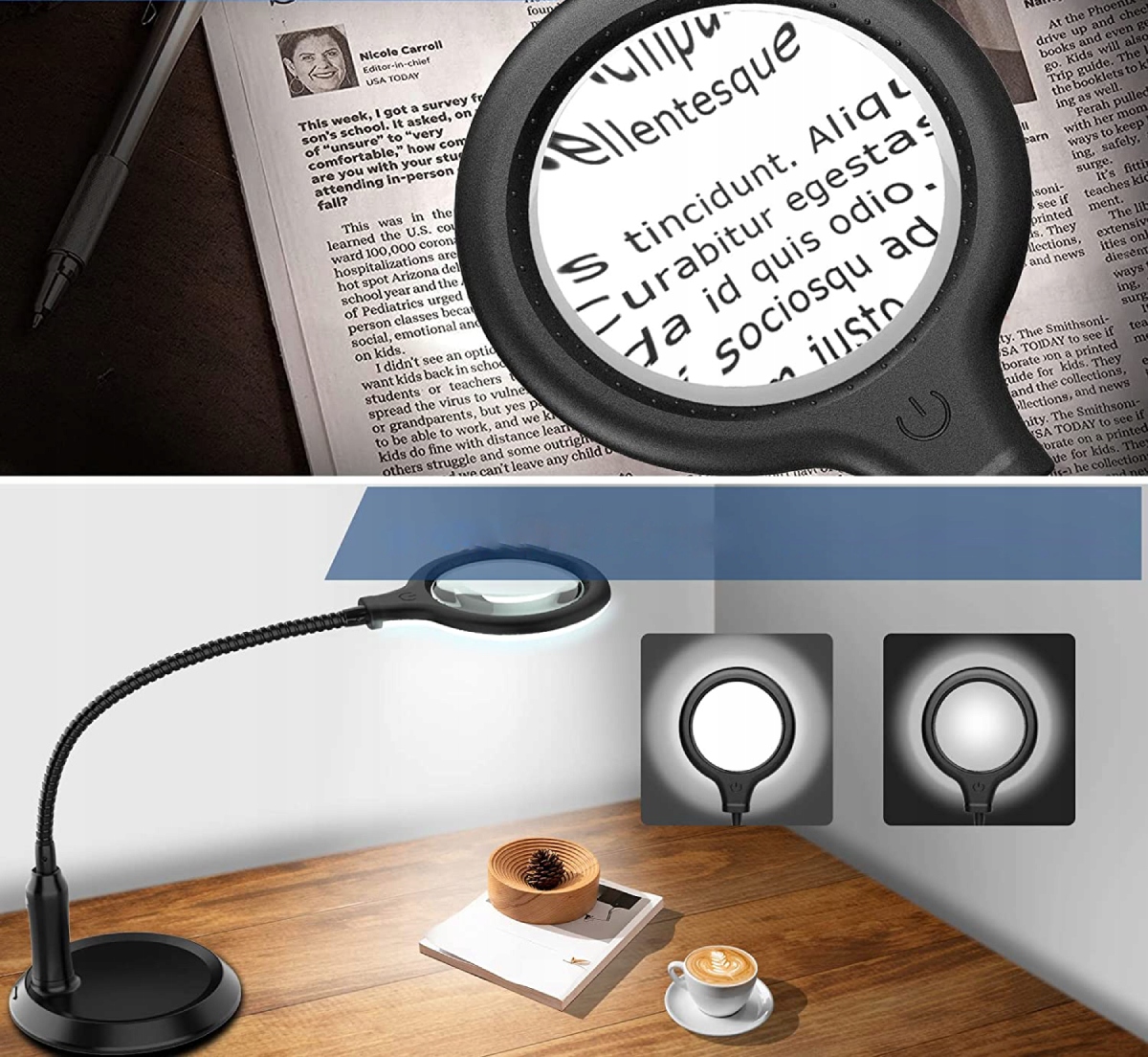 В свете используется сенсорный переключатель, который более удобен, чем переключатель кнопки. И это близко к объективе, его можно легко включать и выключать, нажимать на сенсорный выключатель в течение длительного времени, увеличитель оснащен 30 светодиодами на гусиной шеи, которые являются сильными и долговечными. В сочетании с светом светодиодов светодиодные увеличивают 5x или 500% больше объектов , чем их исходный размер. Вы можете регулировать яркость от 0% до 100% . Оснащен 5-кратным увеличительным объективом.