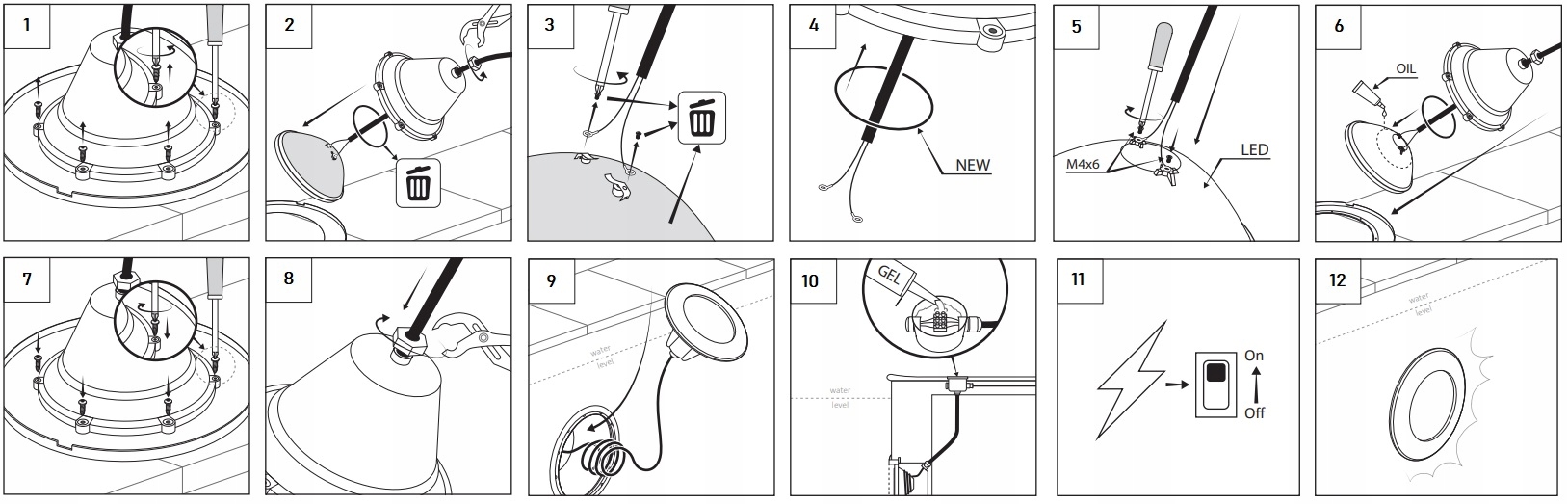 Эти лампы для бассейна должны быть подключены к изолированному трансформатору с двойной катушкой, мощность которого как минимум на 20 % превышает общую потребляемую мощность.