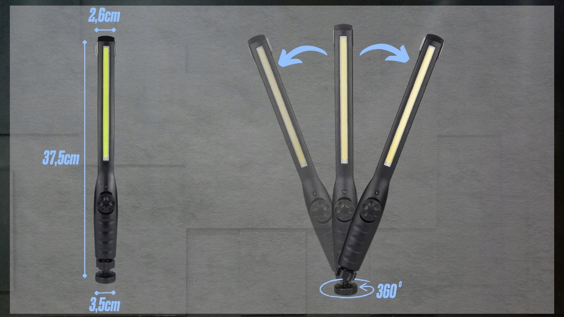 - ✅Вращающийся на 360° кронштейн, установленный на основании, позволяет идеально настроить угол освещения. В зависимости от выполняемых работ светильник можно наклонять в правую или левую сторону.