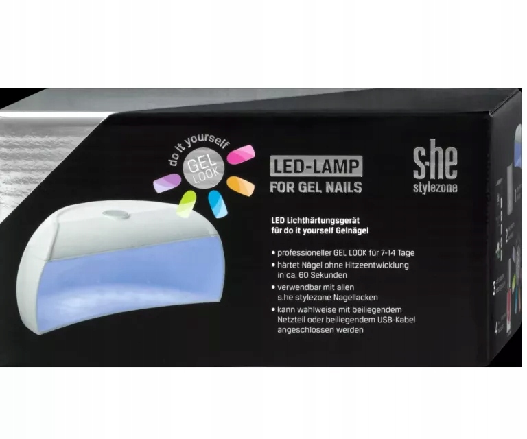 Гель-лампа S.HE для профессиональных гелевых гвоздей в течение 7-14 дней. Это затвердевает гвозди за 60 секунд, без тепла. Его можно использовать со всеми лаком для ногтей S. He Color & Style. Вы можете подключить лампу, используя прилагаемый USB -кабель в упаковке или с помощью источника питания. Спецификация: позиция-нет. 01-940-11/ 5W светодиод. Мощность: 5 Вт, количество лампочек: 33, размер 139 x 70 x 60 мм. Кабель: универсальный источник питания сети. Вход мощности: 100-240 Вак - 50 - 60 Гц. Сила: 5 В --- 1А.