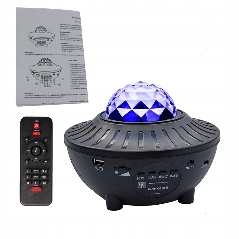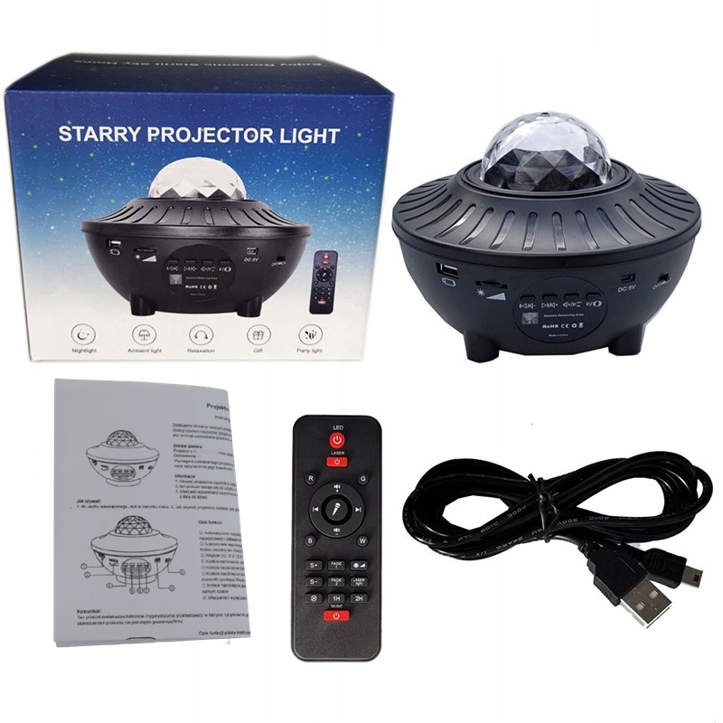 <р>1 . Проектор со светодиодными звездами черный <р>2. Пульт дистанционного управления — для пульта дистанционного управления требуются батарейки (2 батарейки типа ААА в комплект не входят) <р>3. USB-кабель (1,5 м) <р>4. Инструкции на польском языке <р>5. вес 600 г <р>6. Входное напряжение 110–220 В <р>7. Выходное напряжение: 5 В/2000 мА <р>8. Стиль дизайна: Современный <р>9. Режим переключения: Пульт дистанционного управления, ручная кнопка <р>10. Сертификат: CE, ROHS <р>11. Мощность RGB-светодиода: 6 Вт <р>12. Режим зарядки: USB