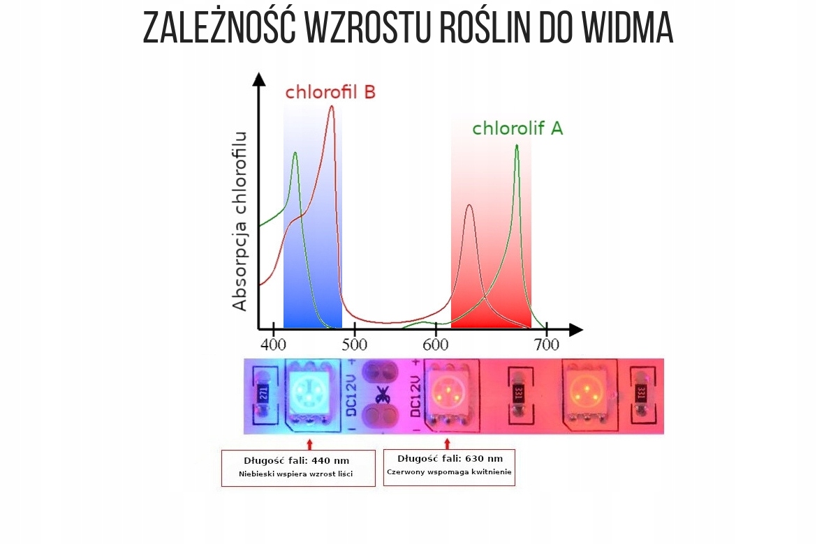 Ниже приведена диаграмма поглощения хлорофилла растениями в зависимости от длины волны излучаемого света. На нем ясно видно, что для синего и красного света поглощение достигает максимальных значений!