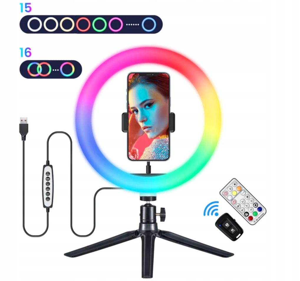 Из них 16 динамических RGB, 15 статических RGB, 3 обычных режима (холодный/теплый/теплый и холодный), а также 10 уровней яркости и динамической скорости, кольцо для макияжа можно настроить в соответствии со всеми вашими потребностями и сделать ваши фотографии или видео более художественными и яркими.